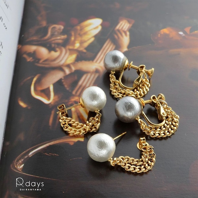 軽くて質感のよいコットンパールとチェーンを組み合わせたピアス/イヤリング。チェーンが耳たぶの裏側に回り込み、キャッチと一体化。ちょっとゴツめのチェーンが印象的。 ■サイズ ・全長:2.1~2.3cm ■重さ(1ペア) ・約2.7~4.9g ■素材 ・金具:合金・真鍮にゴールドカラーメッキ ■お手入れ ・ご使用後はやわらかい布などで、汗、汚れを拭いてください。 ・銀磨き剤などは、メッキを傷める場合がありますので、ご使用にならないでください。 ■備考 ・モニターの発色の具合によって実際のものと色が異なって見える場合があります。 ・製品の仕様は改良のために変更になる場合がございます。 ・ご使用による不具合の発生、チェーンや部品等の破損につきまして、お気軽にお問い合わせください。 不具合の発生部分をお写真に撮りメール添付でお問い合わせいただければ、修理のお見積りをさせていただきます。詳しくは会社概要をご覧ください。 ・金属・チェーン部分はメッキ加工を施してあります。メッキはご使用により次第に摩耗してまいります。 メッキの摩耗については、お修理の範囲外とさせていただきますので、あらかじめご了承ください。 ・アレルギーフリー対応の素材ではございませんので、着用の仕方、体質・体調によっては、かゆみ、 かぶれ等の症状が出る場合がございます。 異常を感じられた際にはただちに使用を中止し、専門医を受診されますようお願いいたします。