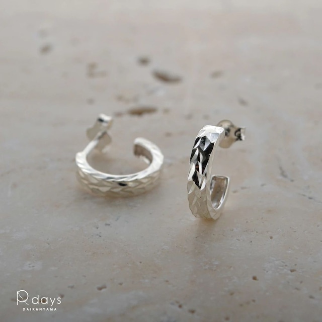シルバーのクリアな輝きに、クラシックな杉綾紋様の彫りを施した、小ぶりなフープピアス。デイリーに使いやすいサイズ感で、横顔に端正な印象をプラスします。 ■サイズ ・直径:約12mm ・幅:約3mm ■重さ(1ペア) ・1.6g ■素材 ・silver925 ■お手入れ ・ご使用後はやわらかい布などで、汗、汚れを拭いてください。銀焼けを防ぐため、チャック付きのビニール袋に入れてお届けします。 ・ご使用にならないときは、汗や汚れを柔らかい布などでふき取り、このビニール袋に入れて、空気を押し出すようにして保管ください。 ・銀製品は素材の特性上、空気に触れると黒っぽく変色(銀焼け)してくることがございます。 銀焼けが気になる際は、液体タイプのシルバーお手入れ剤にてお手入れください。 ■備考 ・モニターの発色の具合によって実際のものと色が異なって見える場合があります。 ・製品の仕様は改良のために変更になる場合がございます。 ・ご使用による不具合の発生、チェーンや部品等の破損につきまして、お気軽にお問い合わせください。 不具合の発生部分をお写真に撮りメール添付でお問い合わせいただければ、修理のお見積りをさせていただきます。詳しくは会社概要をご覧ください。 ・アレルギーフリー対応の素材ではございませんので、着用の仕方、体質・体調によっては、かゆみ、かぶれ等の症状が出る場合がございます。 異常を感じられた際にはただちに使用を中止し、専門医を受診されますようお願いいたします。