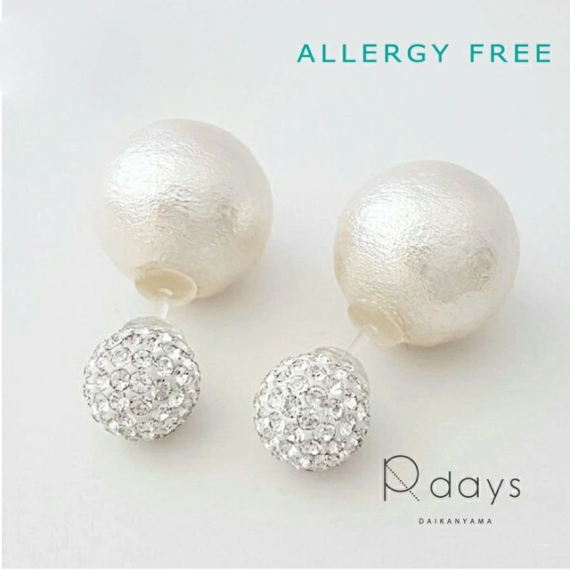 金属アレルギー対応 樹脂ポストの6mmパヴェボールダブルピアス。リバーシブルでも着用可能。シンプルなスタッズピアスとしても着用いただけます。 ■サイズ ・パヴェボール6mm、コットンパール14mm ■重さ(1ペア) ・約2.0g ■素材 ・6mmパヴェボール、14mmコットンパール、樹脂(ポリカーボネイト)ピアス ■お手入れ ・ご使用後はやわらかい布などで、汗、汚れを拭いてください。 ・銀磨き剤などは、メッキを傷める場合がありますので、ご使用にならないでください。 ■備考 ・モニターの発色の具合によって実際のものと色が異なって見える場合があります。 ・製品の仕様は改良のために変更になる場合がございます。 ・ご使用による不具合の発生、チェーンや部品等の破損につきまして、お気軽にお問い合わせください。不具合の発生部分をお写真に撮りメール添付でお問い合わせいただければ、修理のお見積りをさせていただきます。詳しくは会社概要をご覧ください。 ・金属・チェーン部分はメッキ加工を施してあります。メッキはご使用により次第に摩耗してまいります。 メッキの摩耗については、お修理の範囲外とさせていただきますので、あらかじめご了承ください。 ・金属アレルギーに対応した素材ですが、その他の素材にアレルギー反応が出る体質の方は、異常を感じられた際にはただちに使用を中止し、専門医を受診されますようお願いいたします。