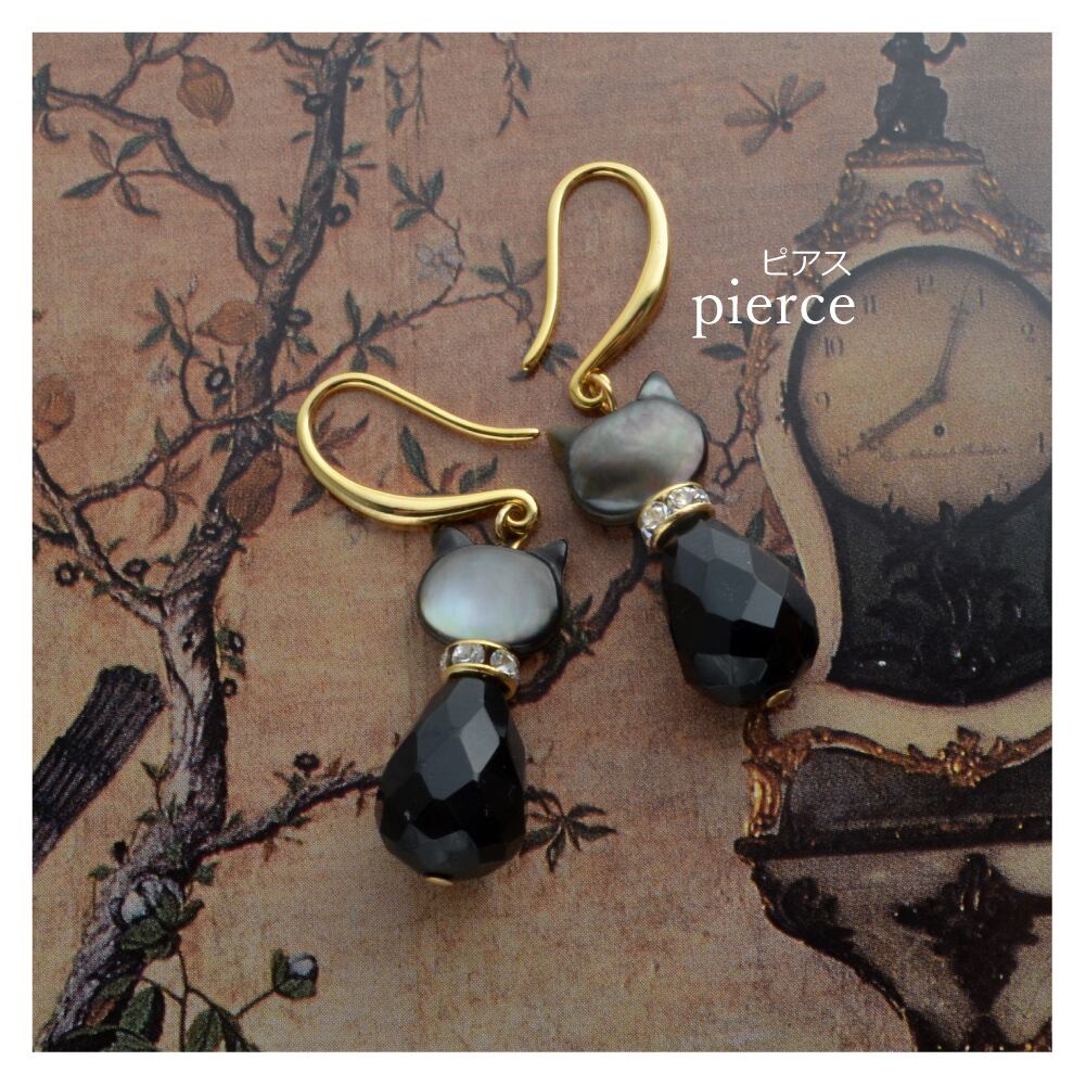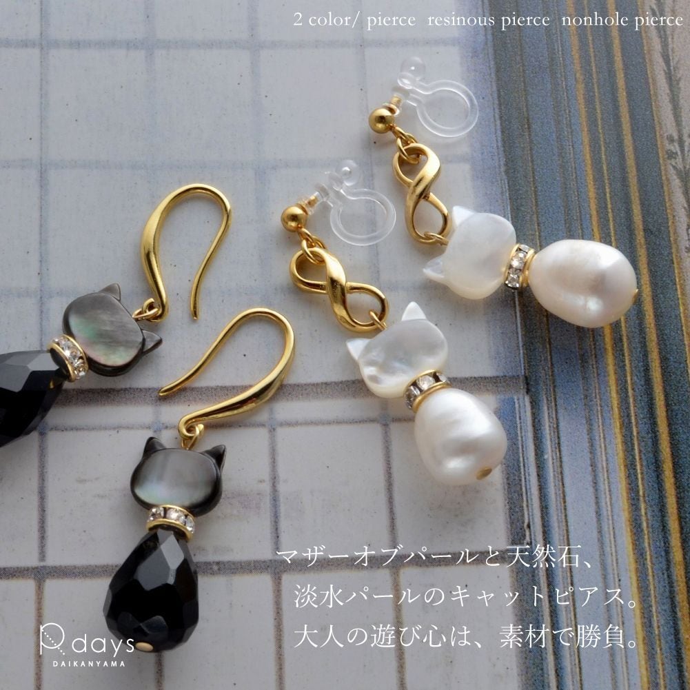 【アレルギーフリーパーツ交換可能】マザーオブパール キャットモチーフ ピアス ノンホールピアス/p0826