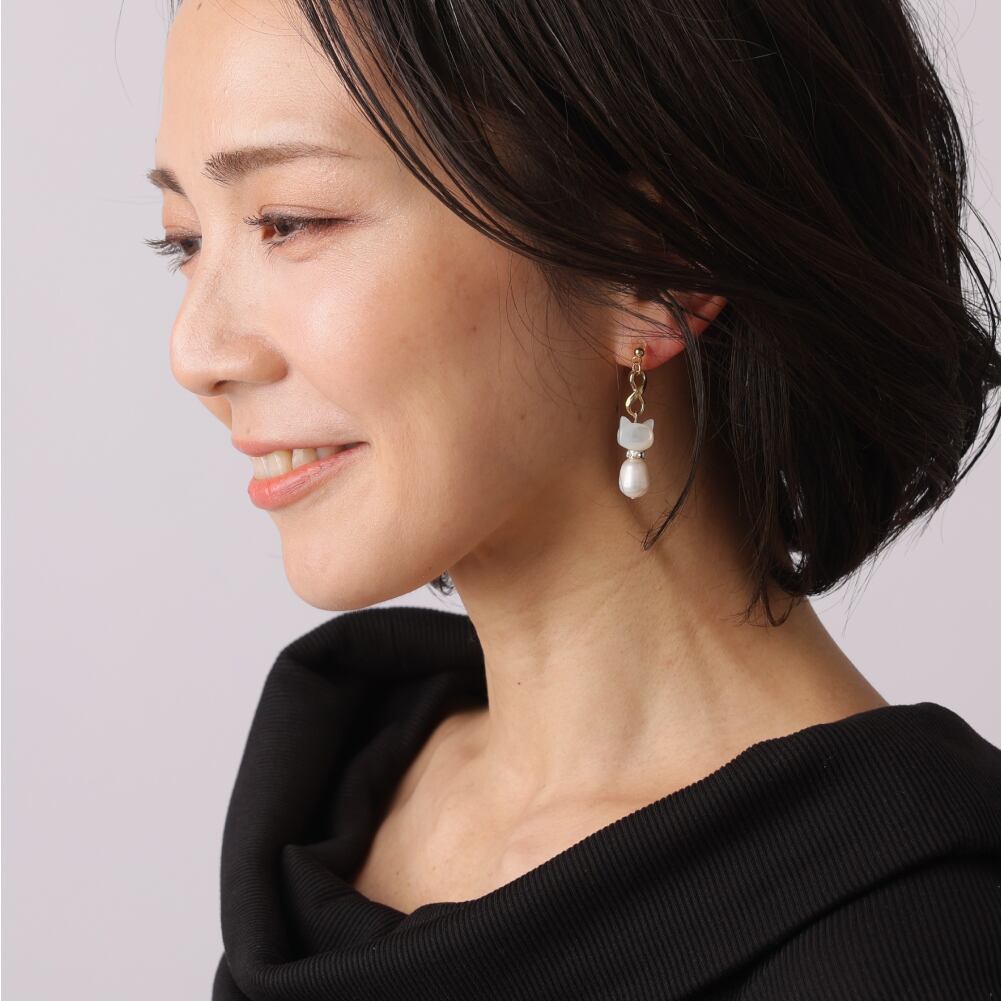虹色に輝くマザーオブパールにブラックオニキス、淡水パールを配したピアス/イヤリング。愛らしいモチーフだからこそ、大人の遊び心は、素材で勝負。アレルギーフリー仕様も。