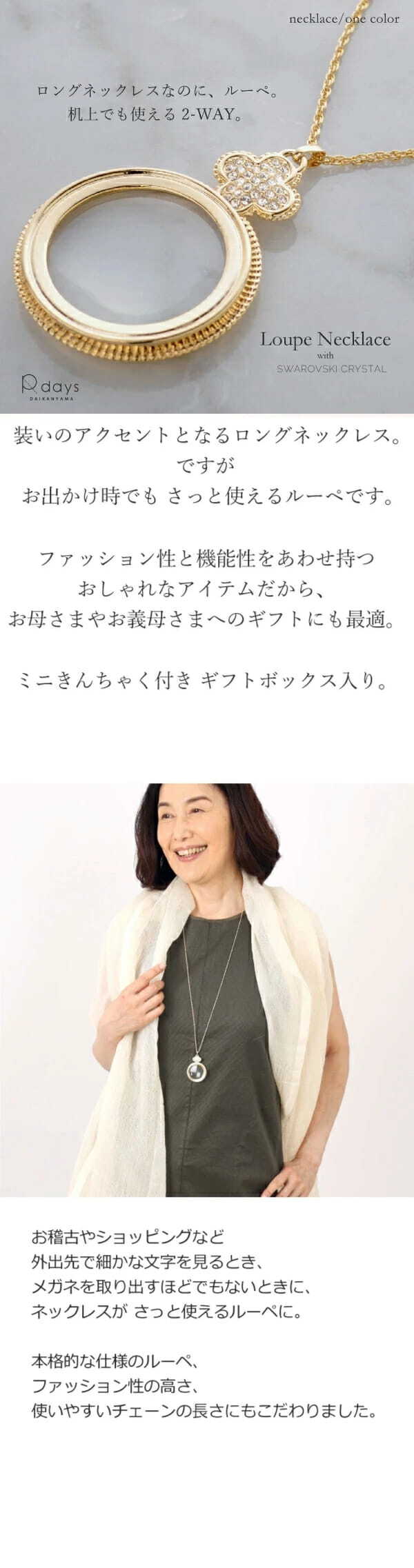 敬老の日のギフトに。モチーフ部分がルーペになった ロングネックレス。スワロフスキー・クリスタルの輝きが、華やかな印象。外出先でもさっと使え、ファッション性と機能性を両立。