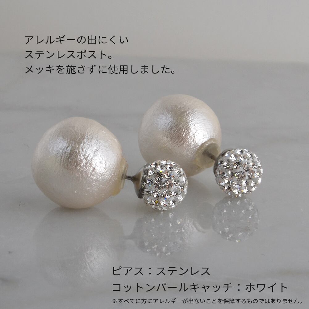 チェコ・プレシオサ社製のクリスタルを埋め込んだオリジナル・パヴェボールと、コットンパールキャッチのダブルピアス。学校行事や冠婚葬祭のシーンに上品さ、華やかさを添えます。