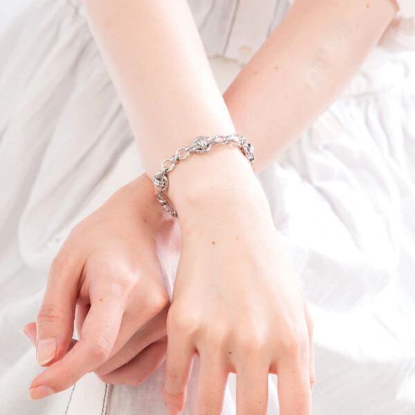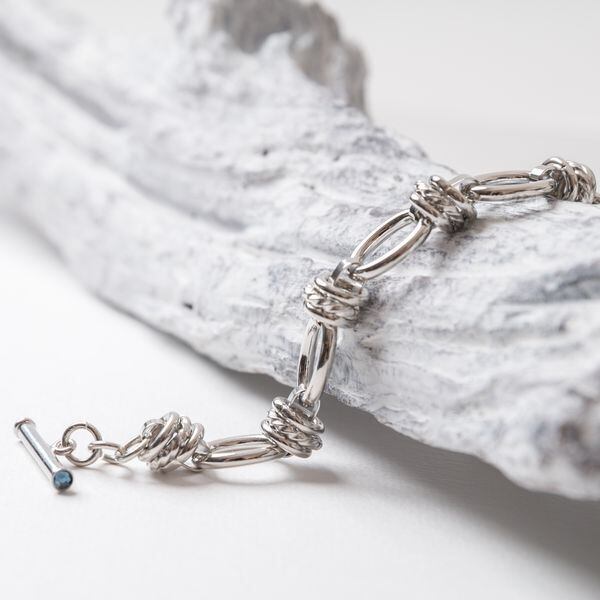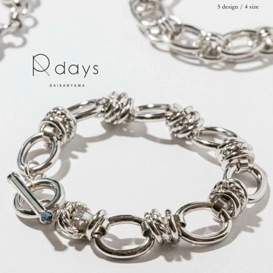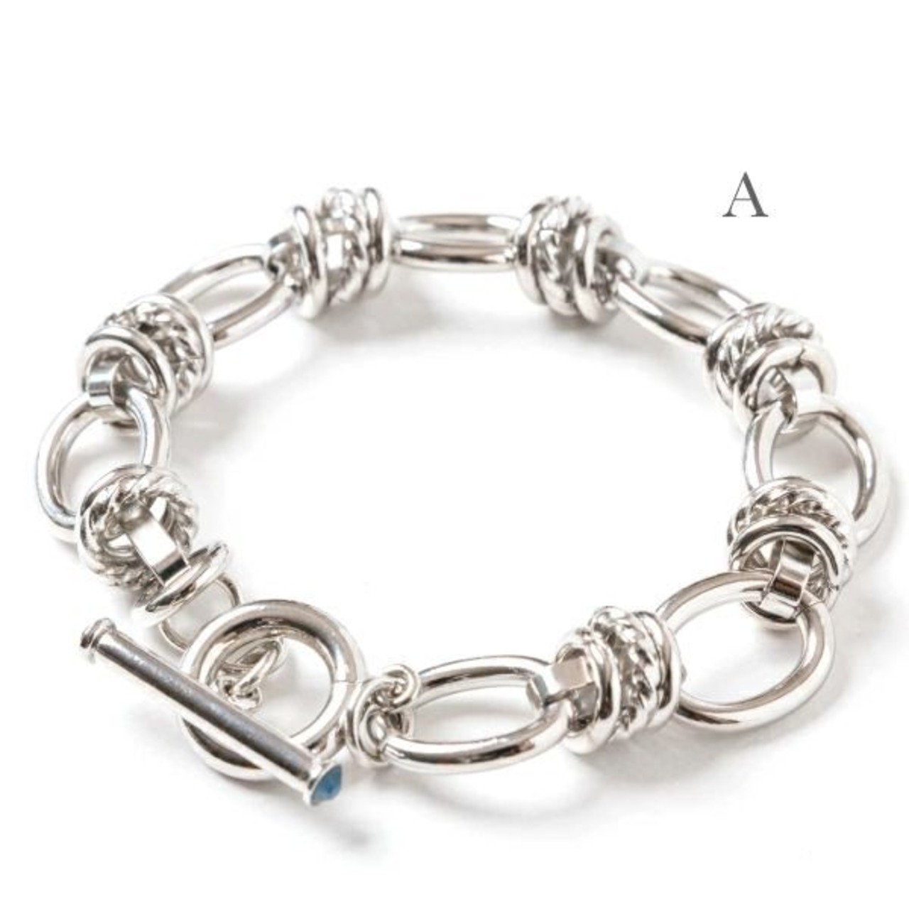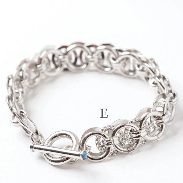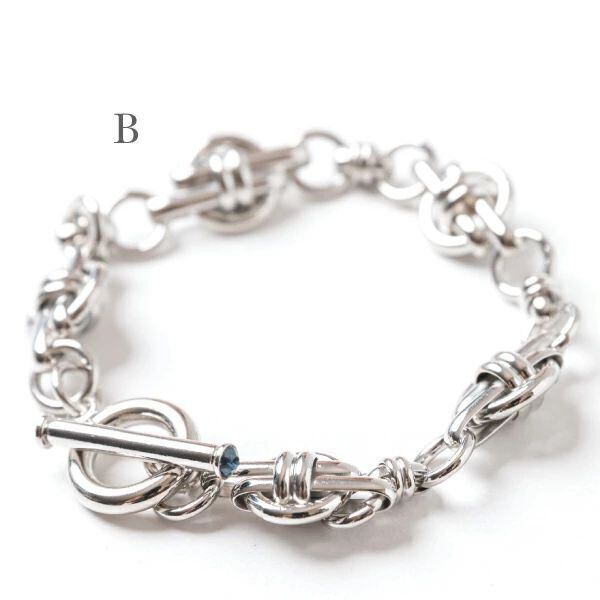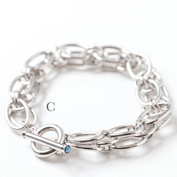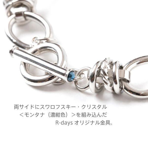 ボリューム感あるシルバーカラーのチェーンによるソリッドなブレスレット。マンテル部分には、スワロフスキー・クリスタルのモンタナ(濃紺色)を配しました。S〜LLまで3サイズ。