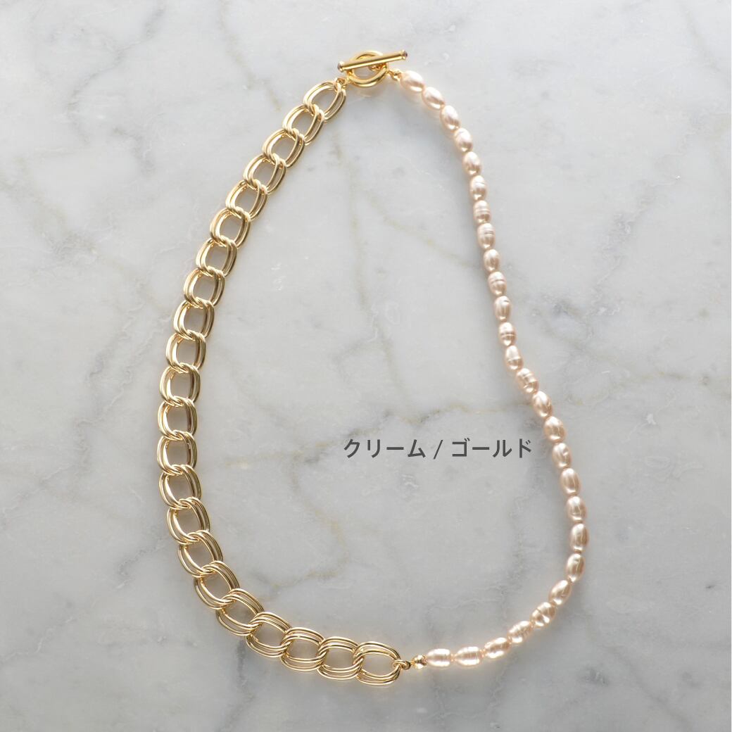 バロックパールのような長粒のガラスパールと、存在感あるチェーンがハーフアンドハーフになったネックレス。Y字で着用したり、手首に巻けばブレスレットにも。4-WAYでご使用可能。