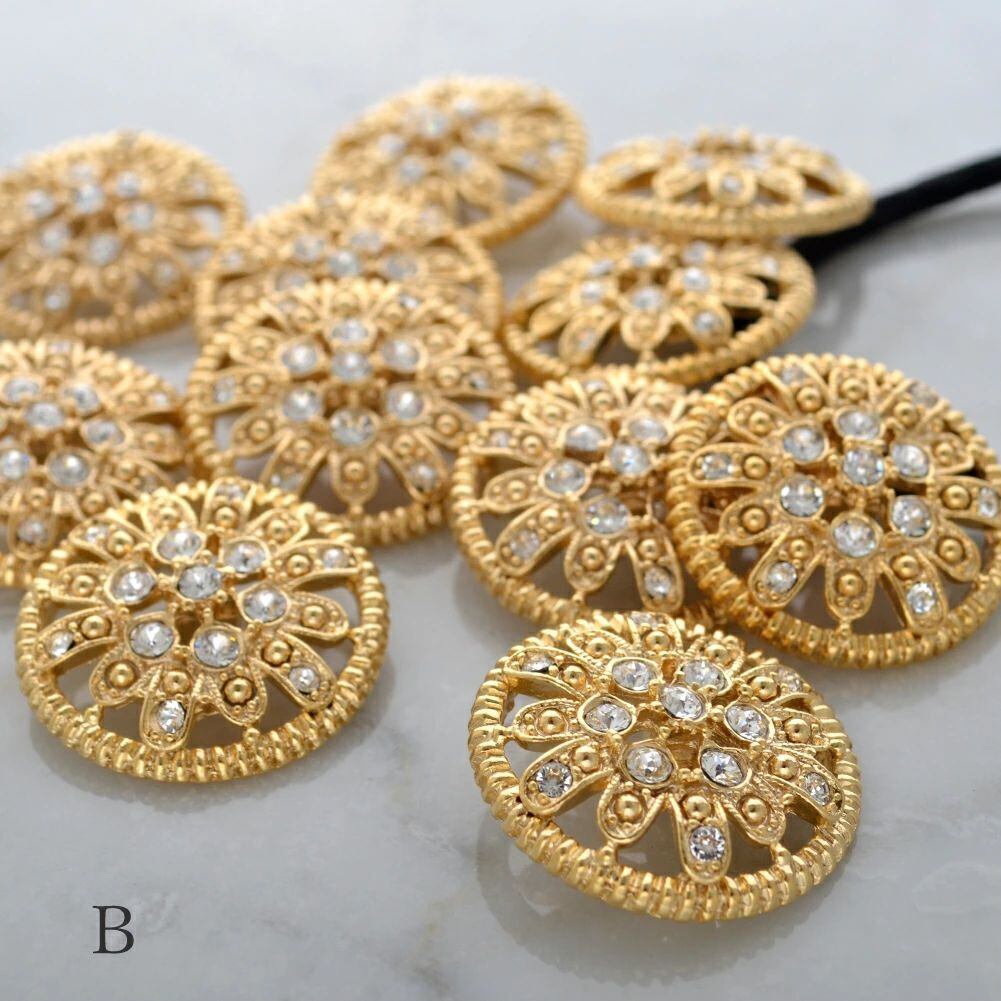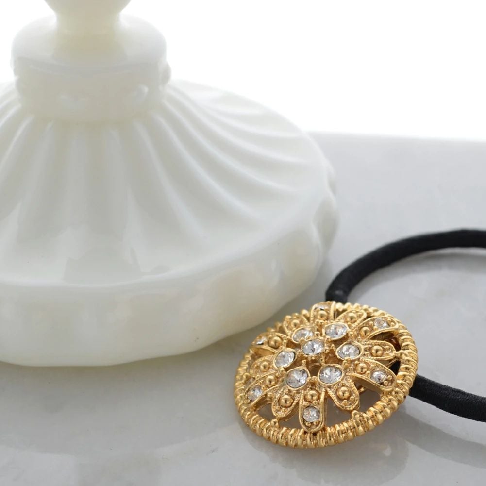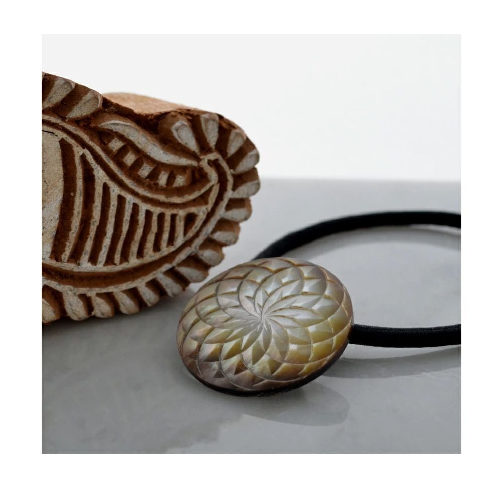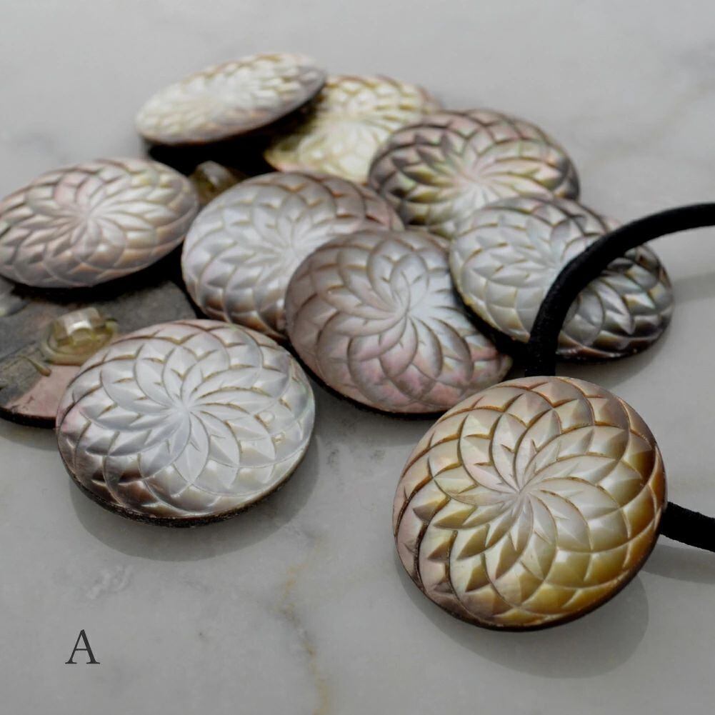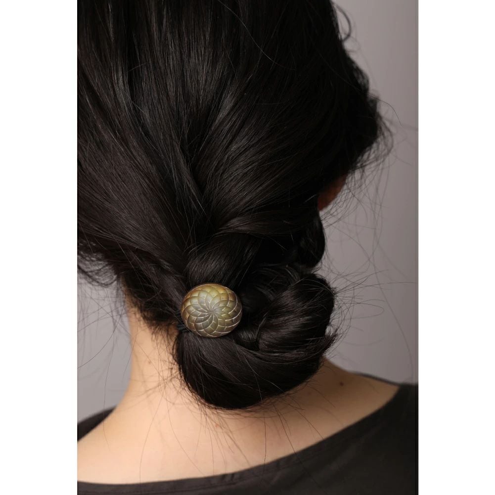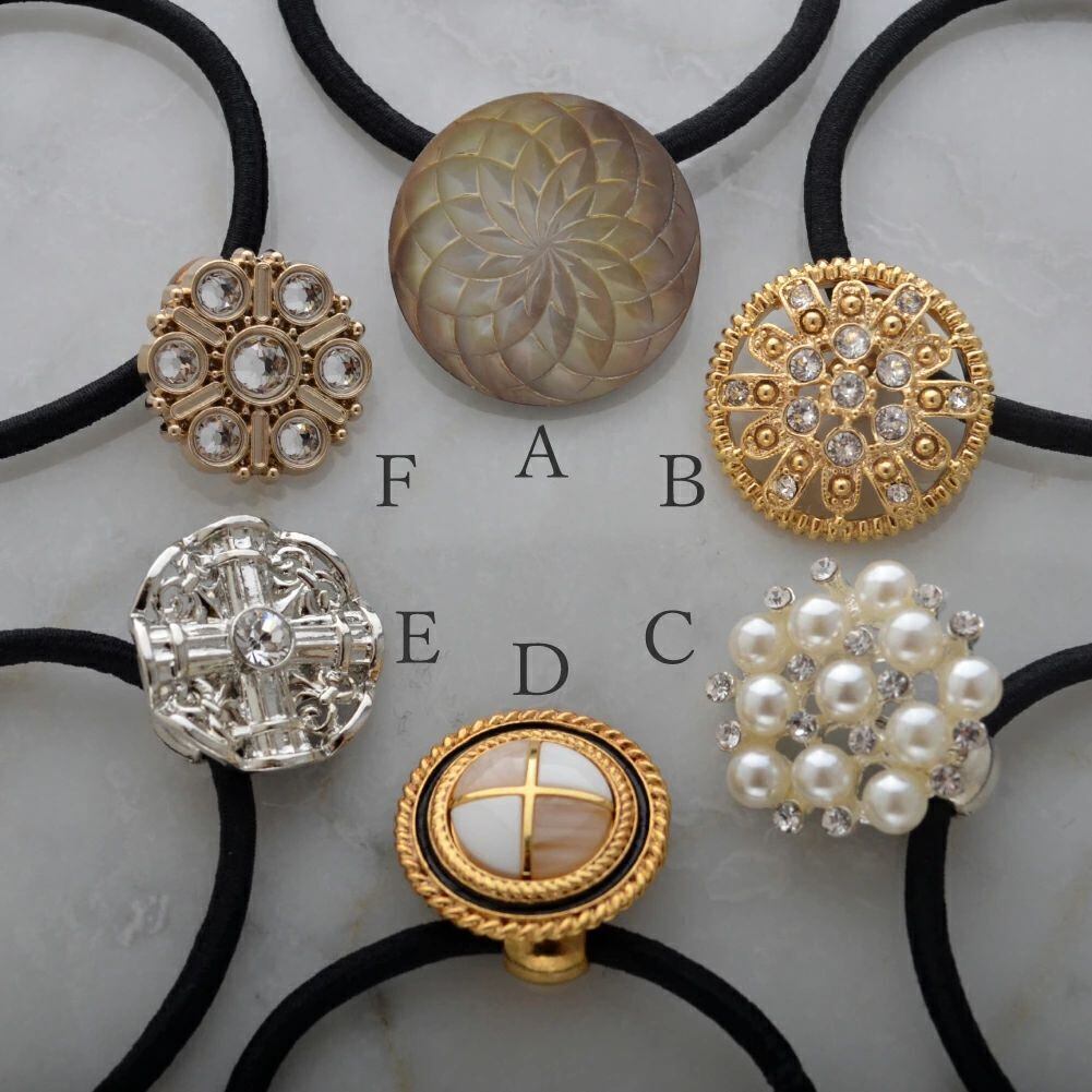稀少なヴィンテージボタンを使用したヘアゴム6種。黒蝶貝やメタルベースの凝ったデザイン、重厚で存在感あるモチーフが、大人のヘアを美しく彩ります。和服や浴衣のアップヘアにも。