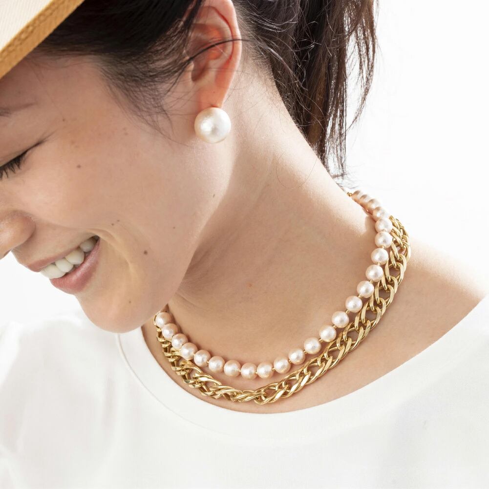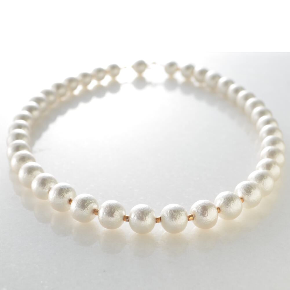 8mmコットンパールのベーシックなネックレス。軽くて質感の良いコットンパールで フォーマルからカジュアルまでアレンジや重ねづけも自在。同径のコットンパールによるクラスプ金具。