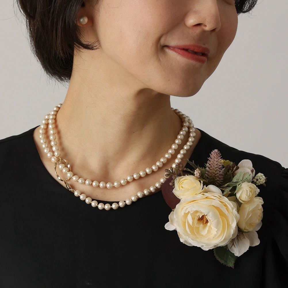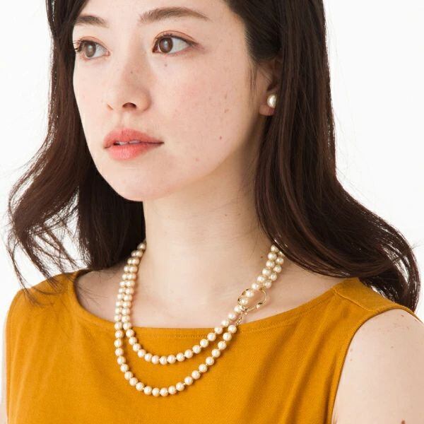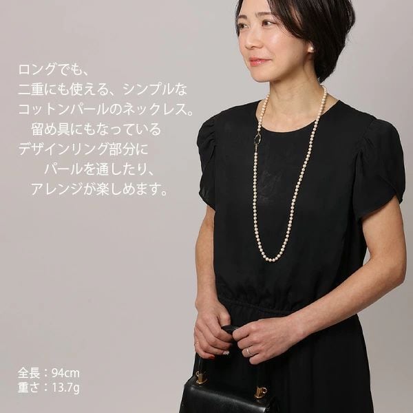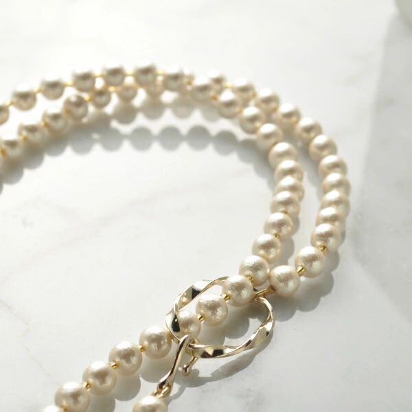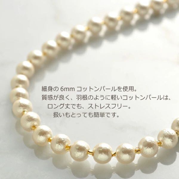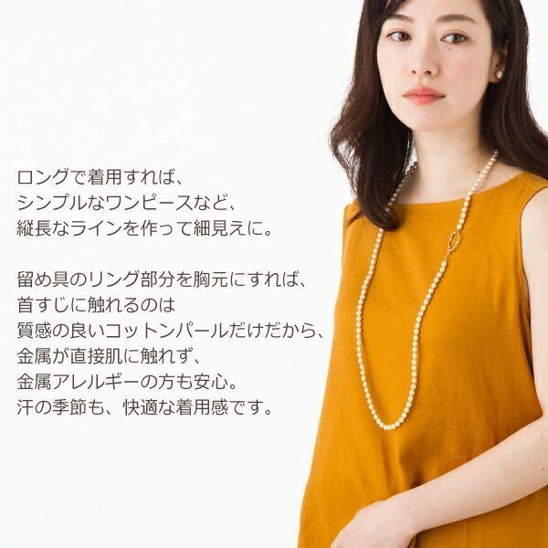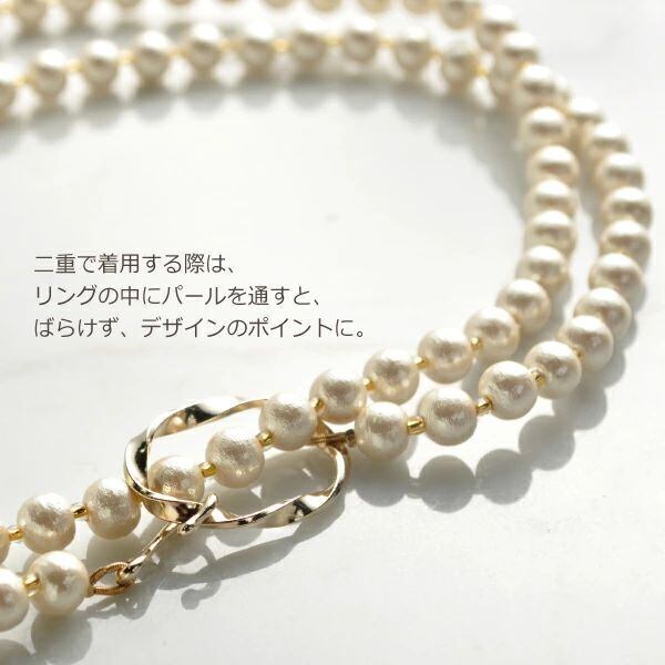 ロングでも、二重巻きでも使える2-WAY仕様のコットンパール・ネックレス。 留め具になっているデザインリングで、アレンジ自在。 肌に直接金属が触れず、金属アレルギーの方も安心です。