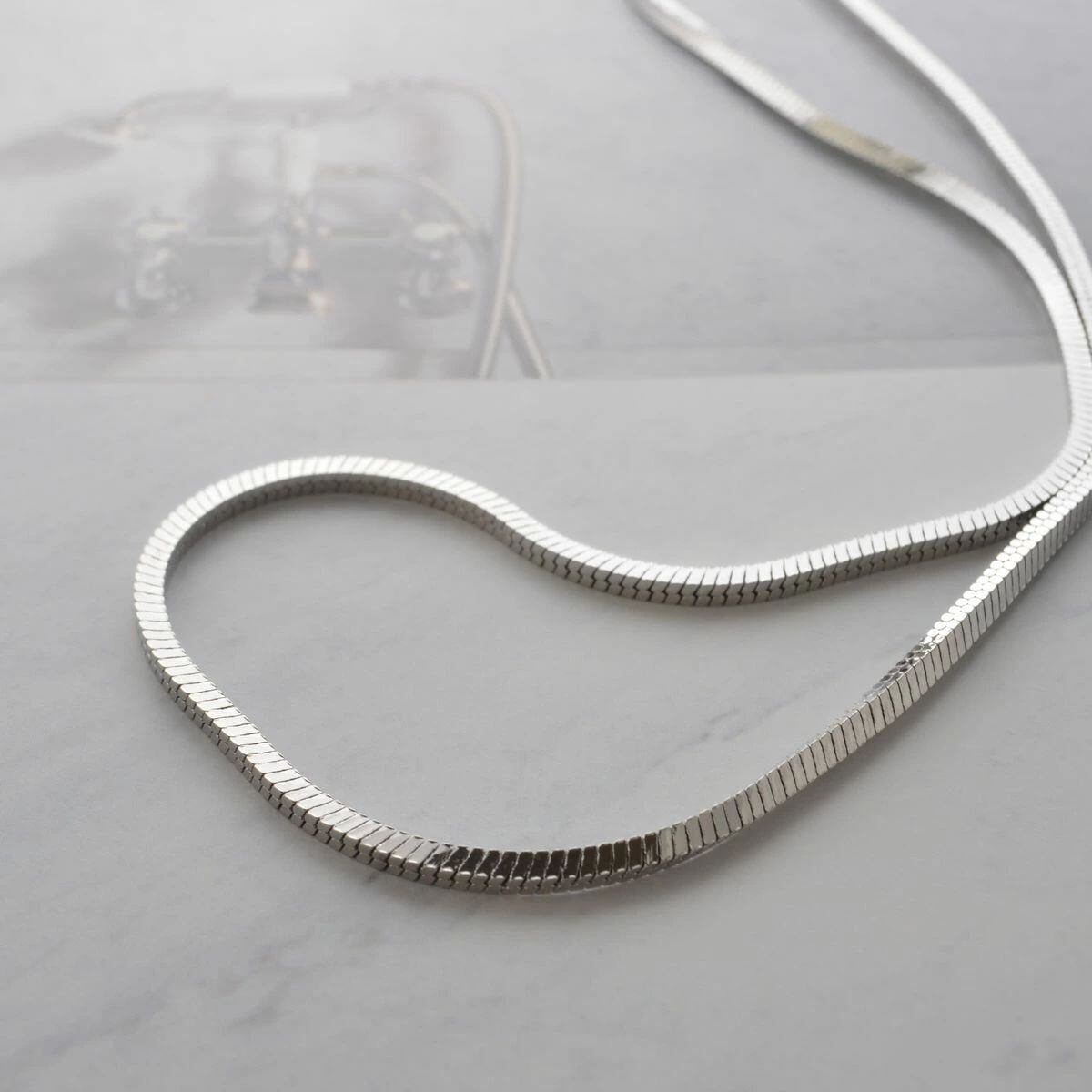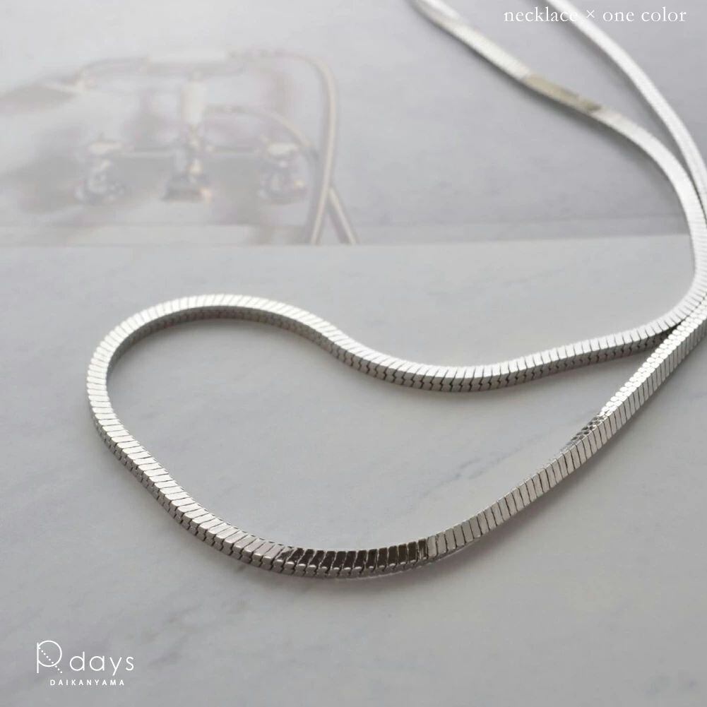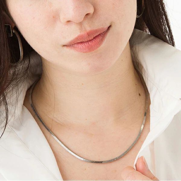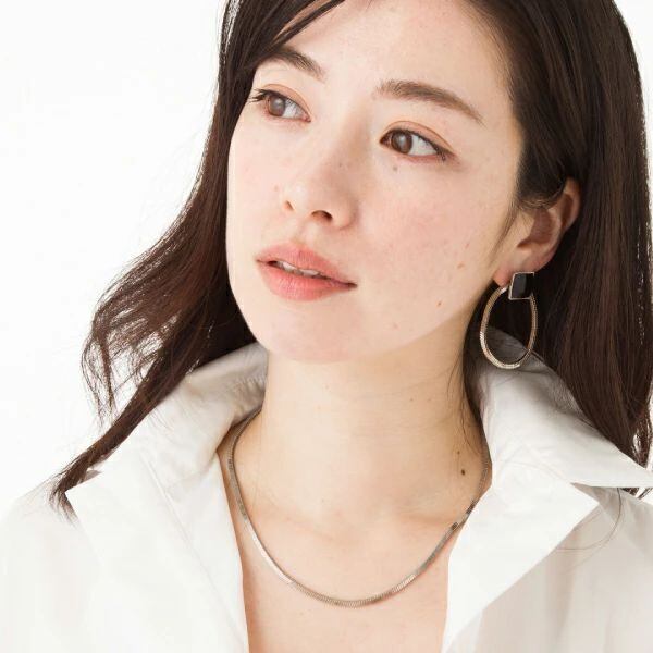 しなやかなスネークチェーンを使ったショートネックレス。きりっとした角型のチェーンだから、品質の確かさと、存在感が漂います。同じチェーンを使ったピアスもございます。