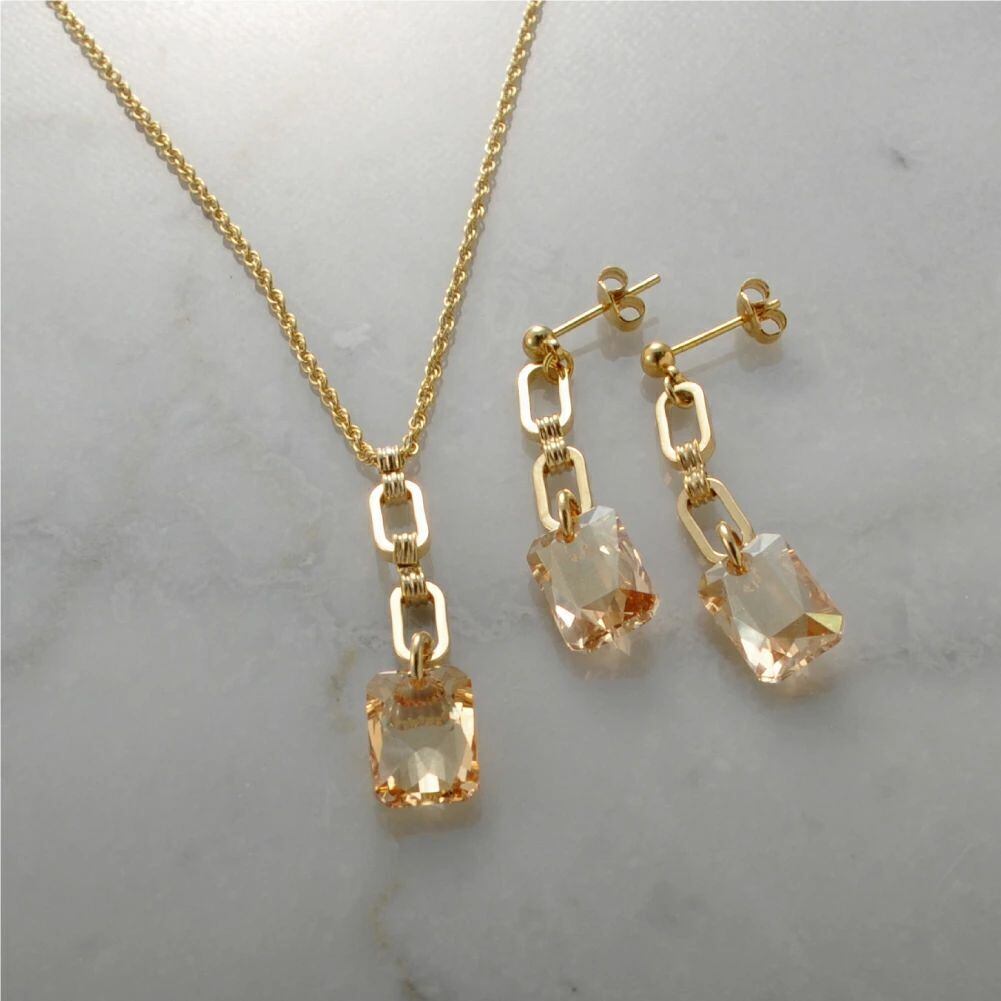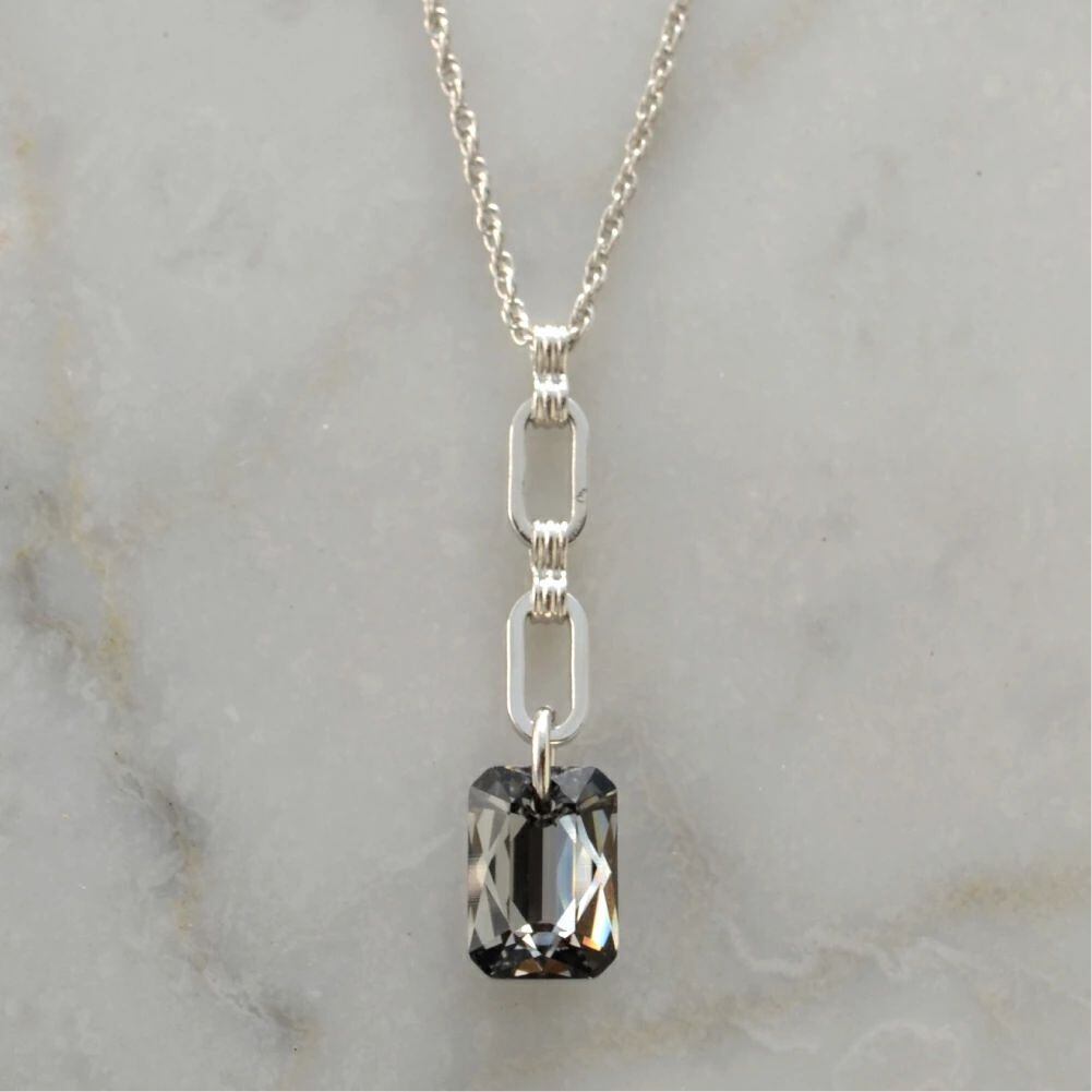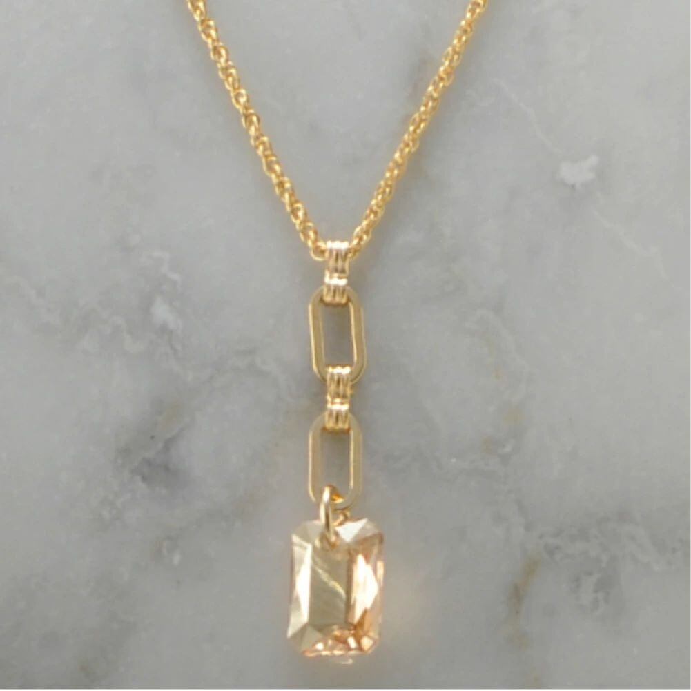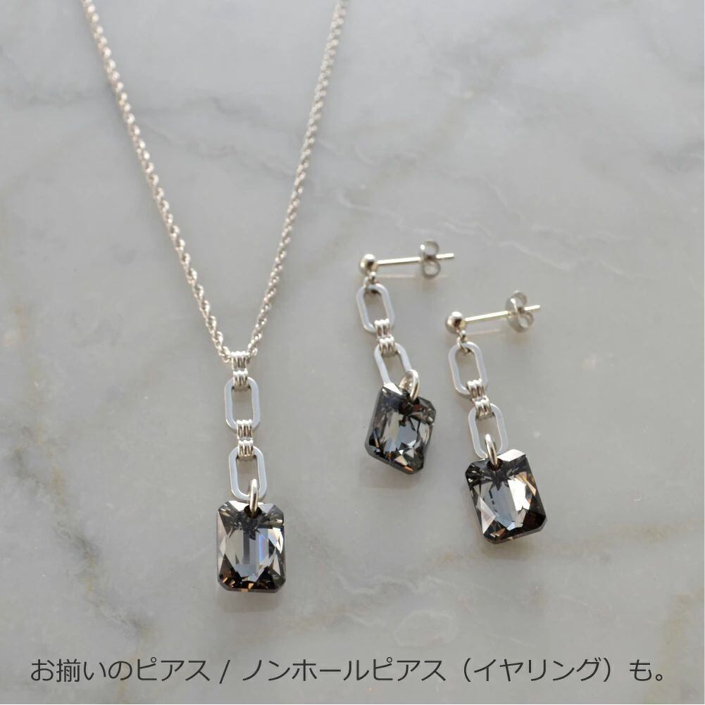 きりっとソリッドな輝きの、42面カットを施したスワロフスキークリスタルを配したネックレス。2色展開。デザインチェーンのセミロングネックレス。