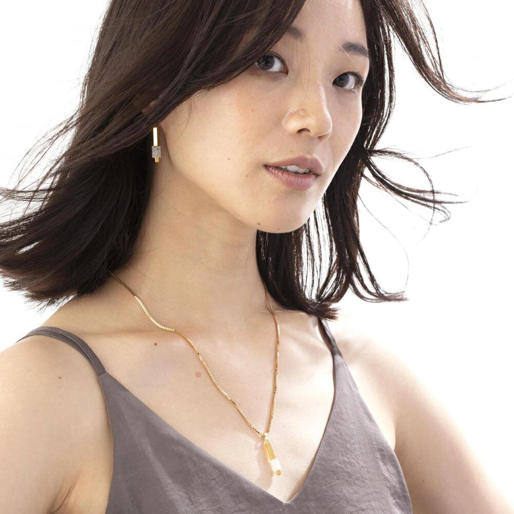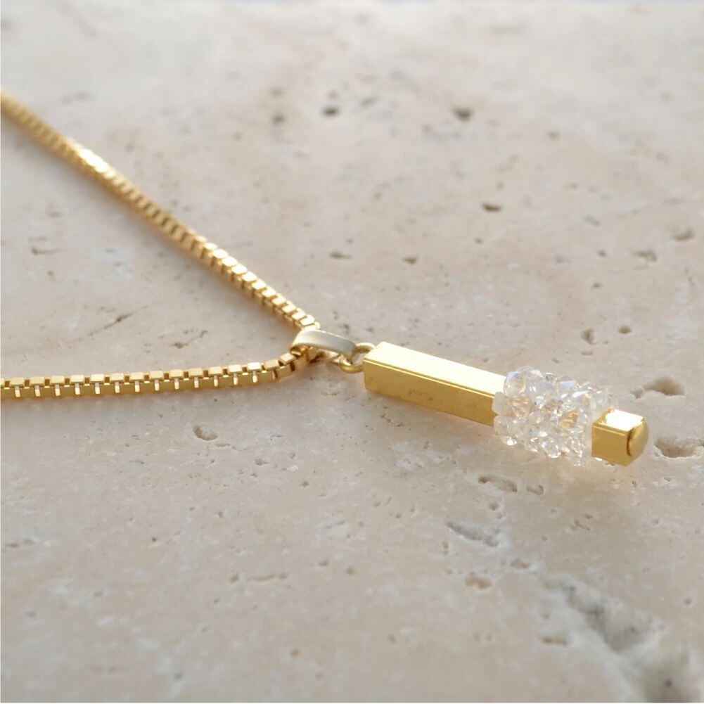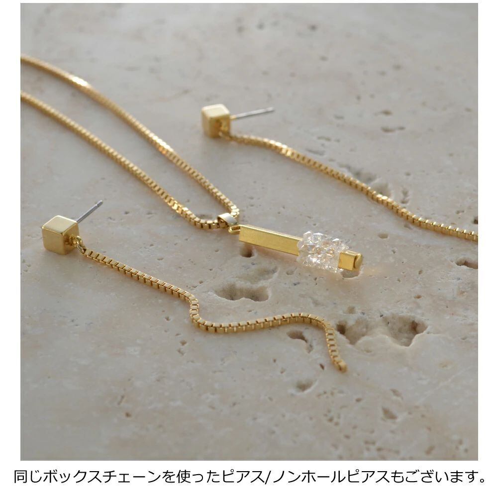 極小のスワロフスキー・クリスタルをぎゅっと固めたようなパーツを配したトップモチーフ。ボックスチェーンの個性的な表情を加え、スクエアなイメージ。