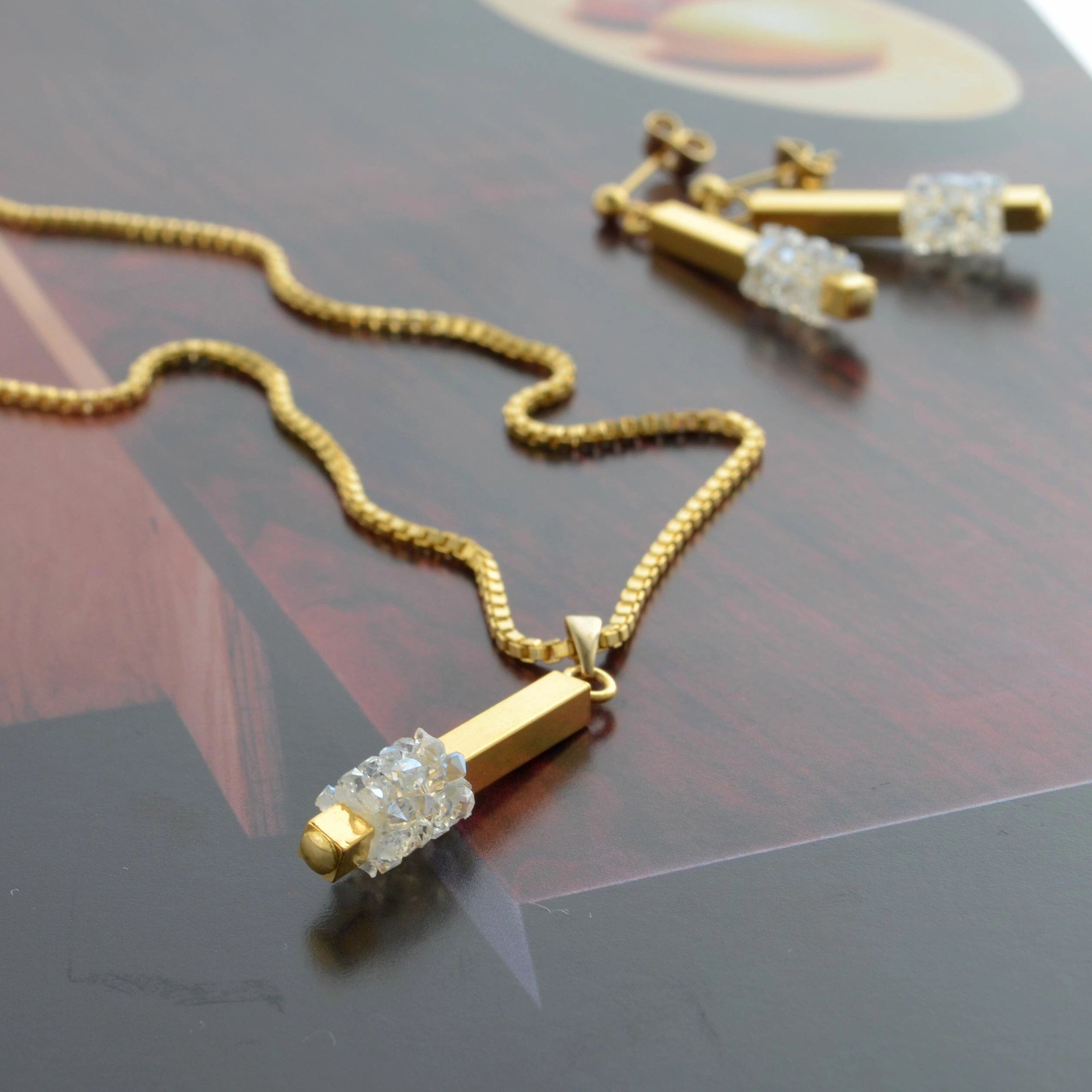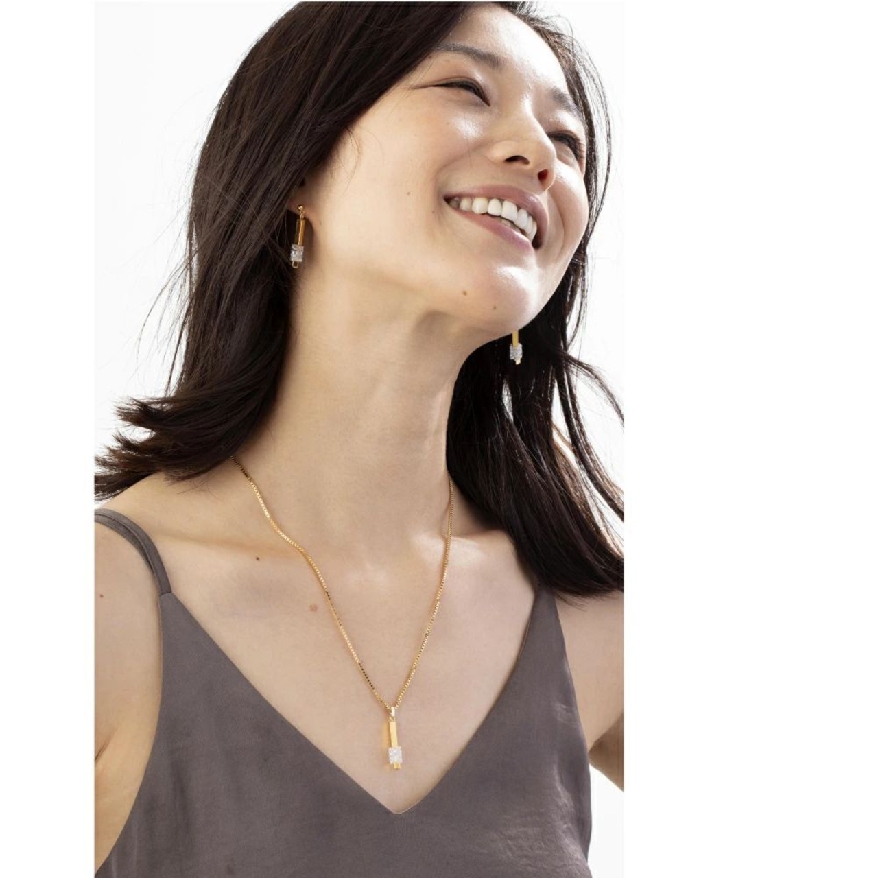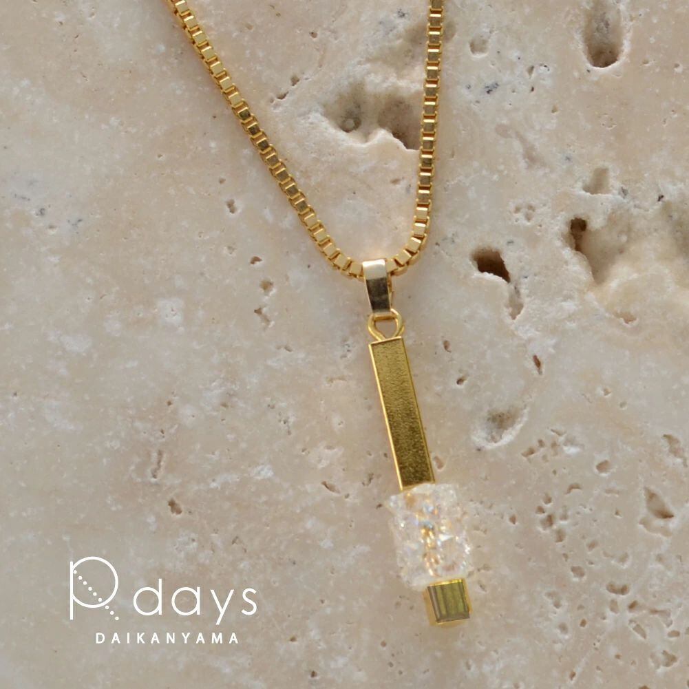 極小のスワロフスキー・クリスタルをぎゅっと固めたようなパーツを配したトップモチーフ。ボックスチェーンの個性的な表情を加え、スクエアなイメージ。