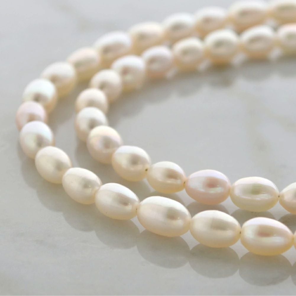 長粒の淡水パールを連ねたシンプルなネックレス。ほどよい玉サイズで、真珠層が厚く 照りの美しいパール、首元に添う長さ、小ぶりなクラスプ。MとLの2サイズご用意しました。