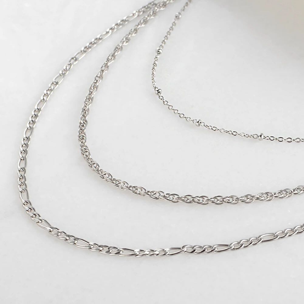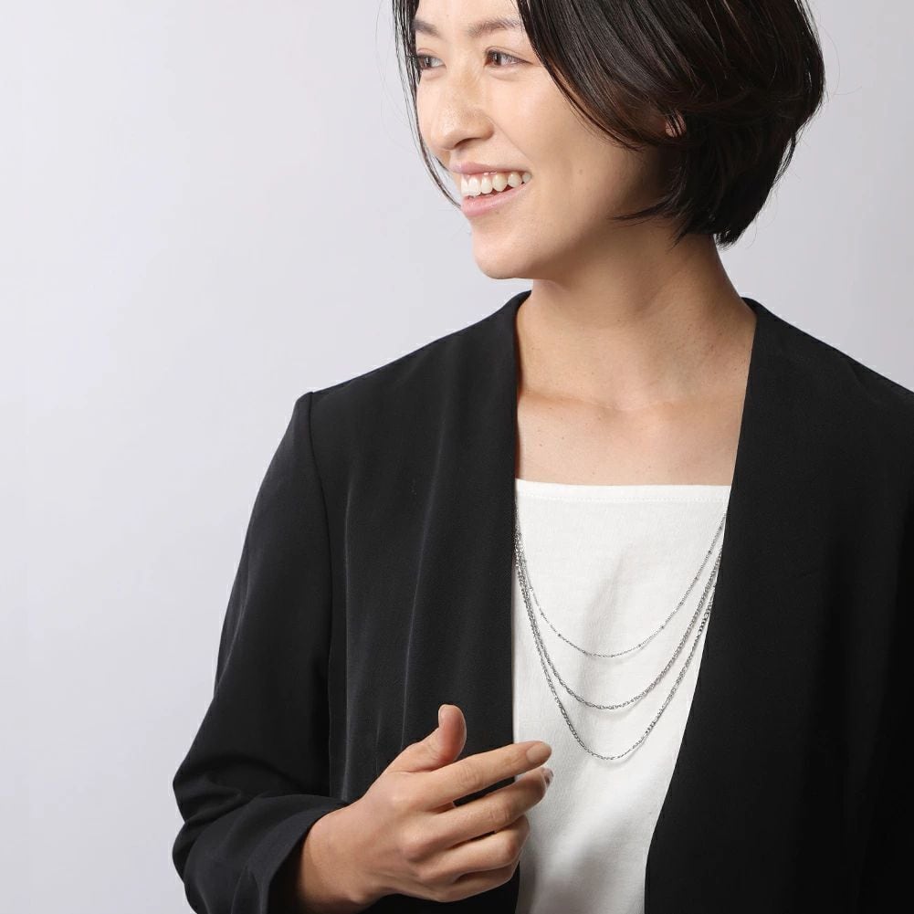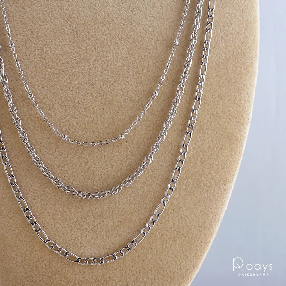 表情の違う3種のチェーンによるロングネックレス。低アレルギーのオールステンレス製で、汗の季節にも安心。水洗いも可能。さざ波のように連なるチェーンで華やかなアクセントに。