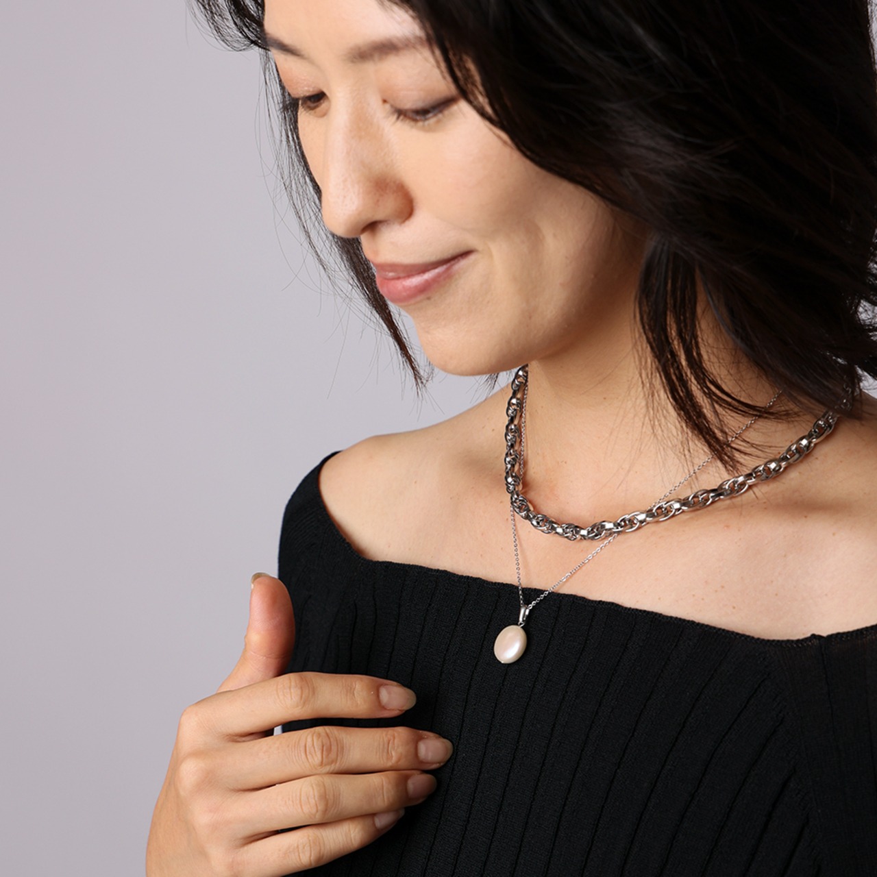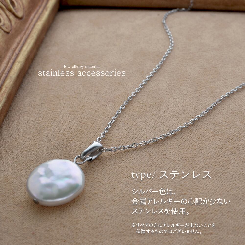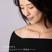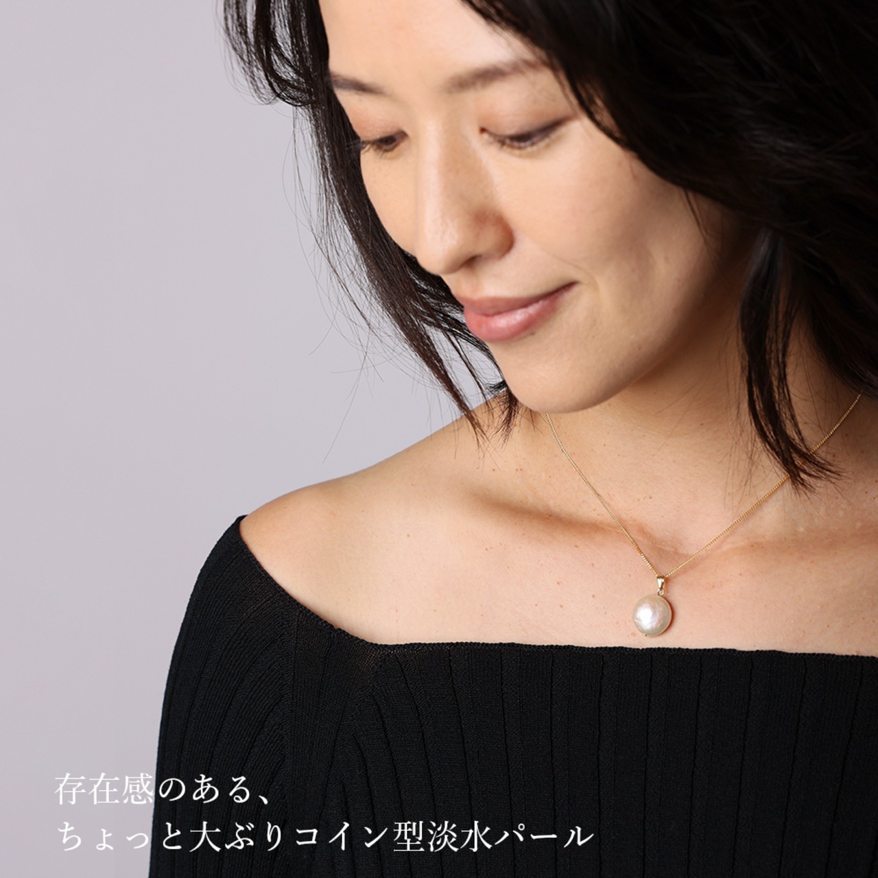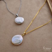 ちょっと大ぶりのコイン型淡水パールをひと粒使ったネックレス。ゴールドカラー・ステンレスの2タイプ。スライドボールで微妙な長さも調整可能。レイヤードスタイルが楽々決まる。
