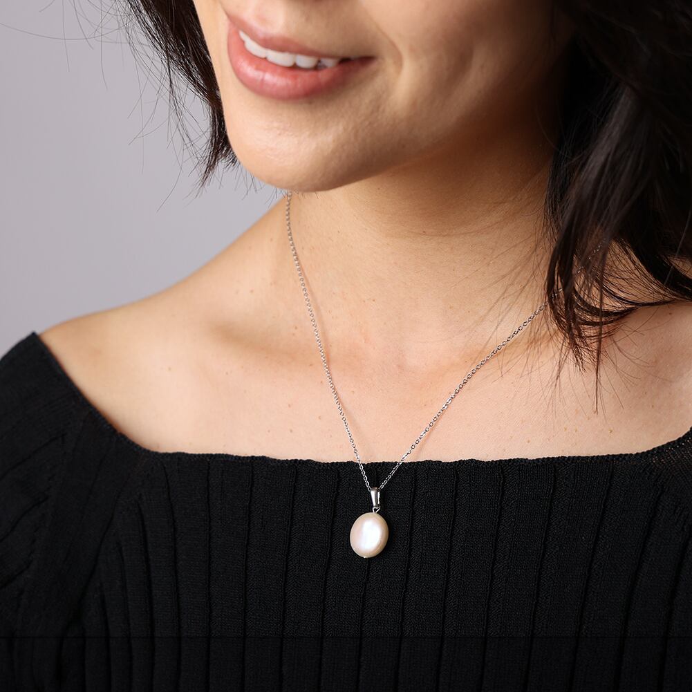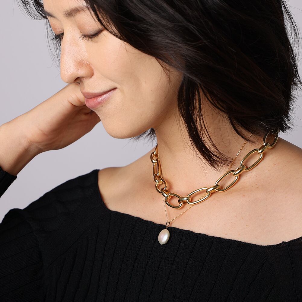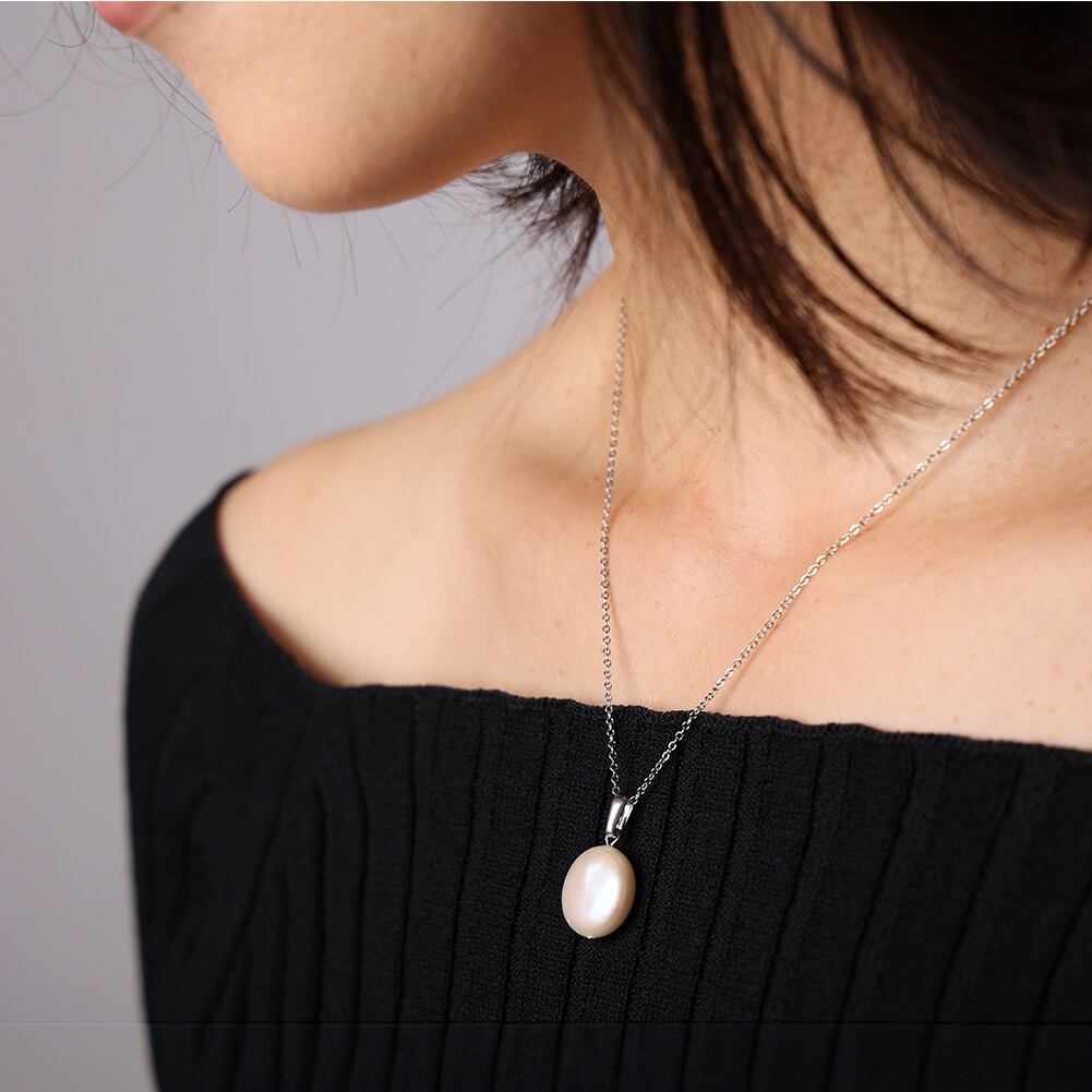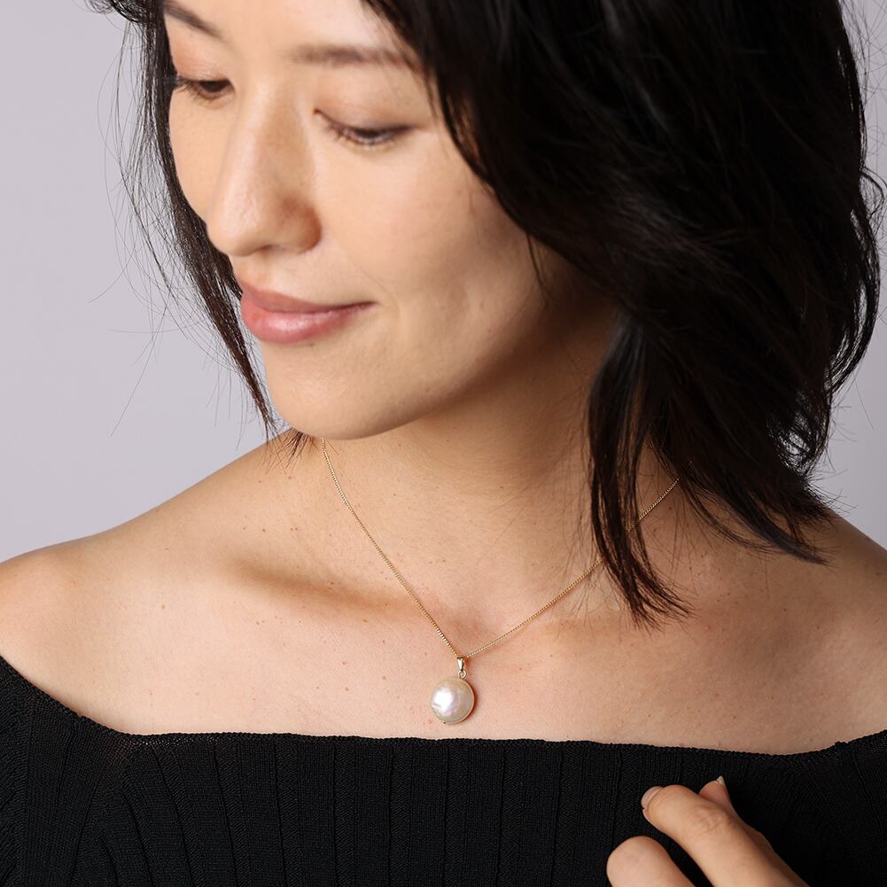 ちょっと大ぶりのコイン型淡水パールをひと粒使ったネックレス。ゴールドカラー・ステンレスの2タイプ。スライドボールで微妙な長さも調整可能。レイヤードスタイルが楽々決まる。