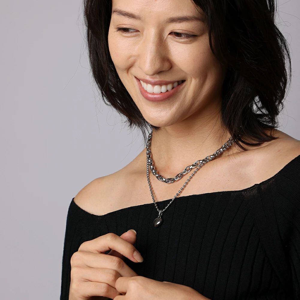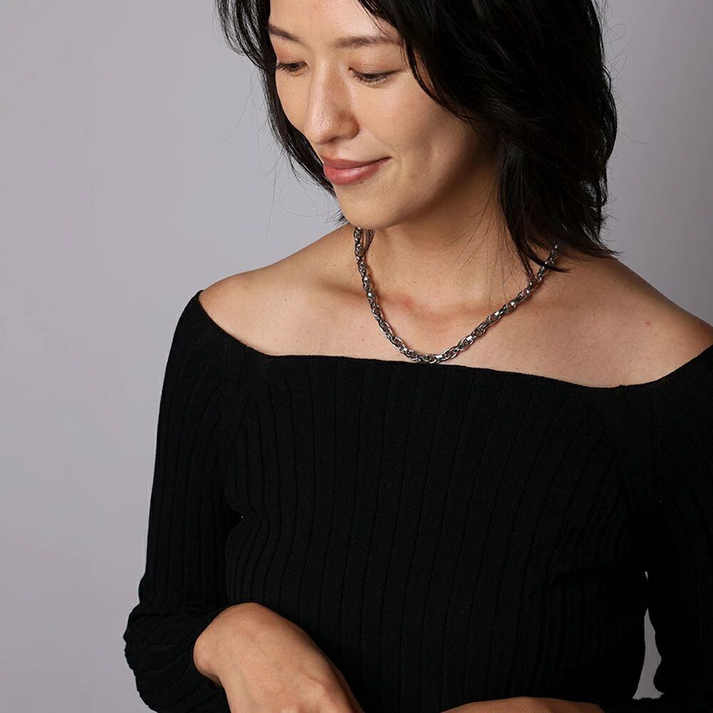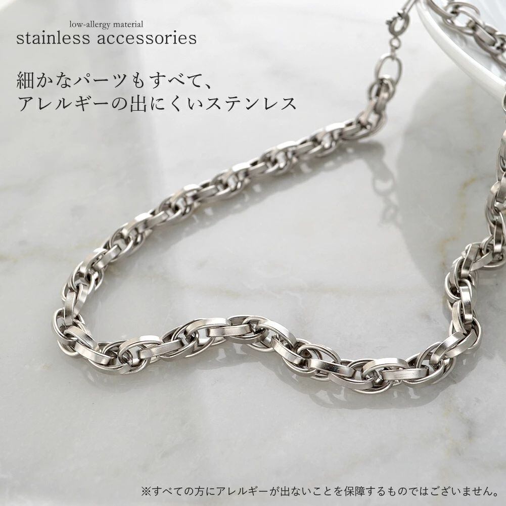 ボリューム感あるチェーンが首元にインパクトをプラスするステンレスネックレス。短めですっきりかっこよく。低アレルギーで汗や汚れに強く、美しい輝きが続きます。3サイズ。