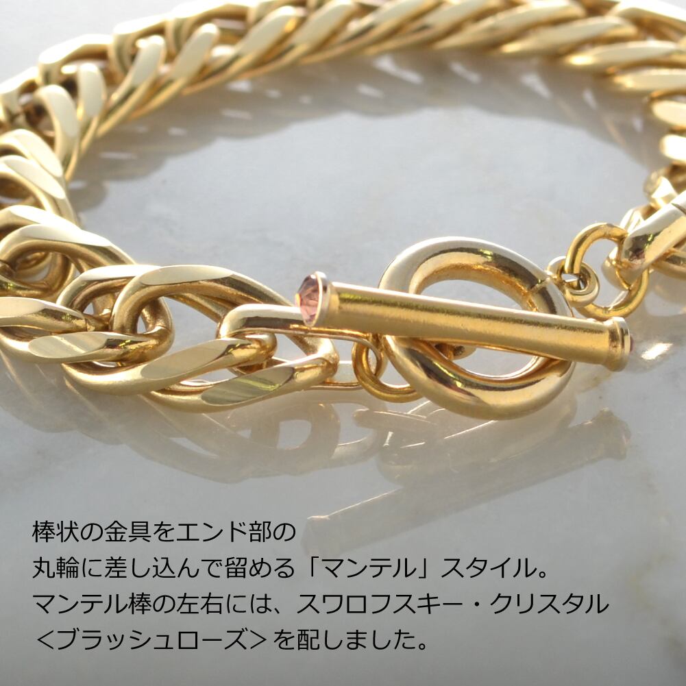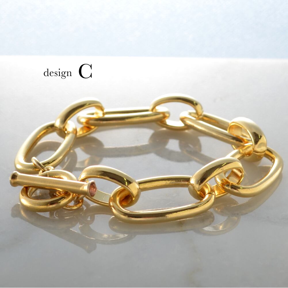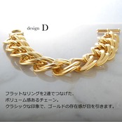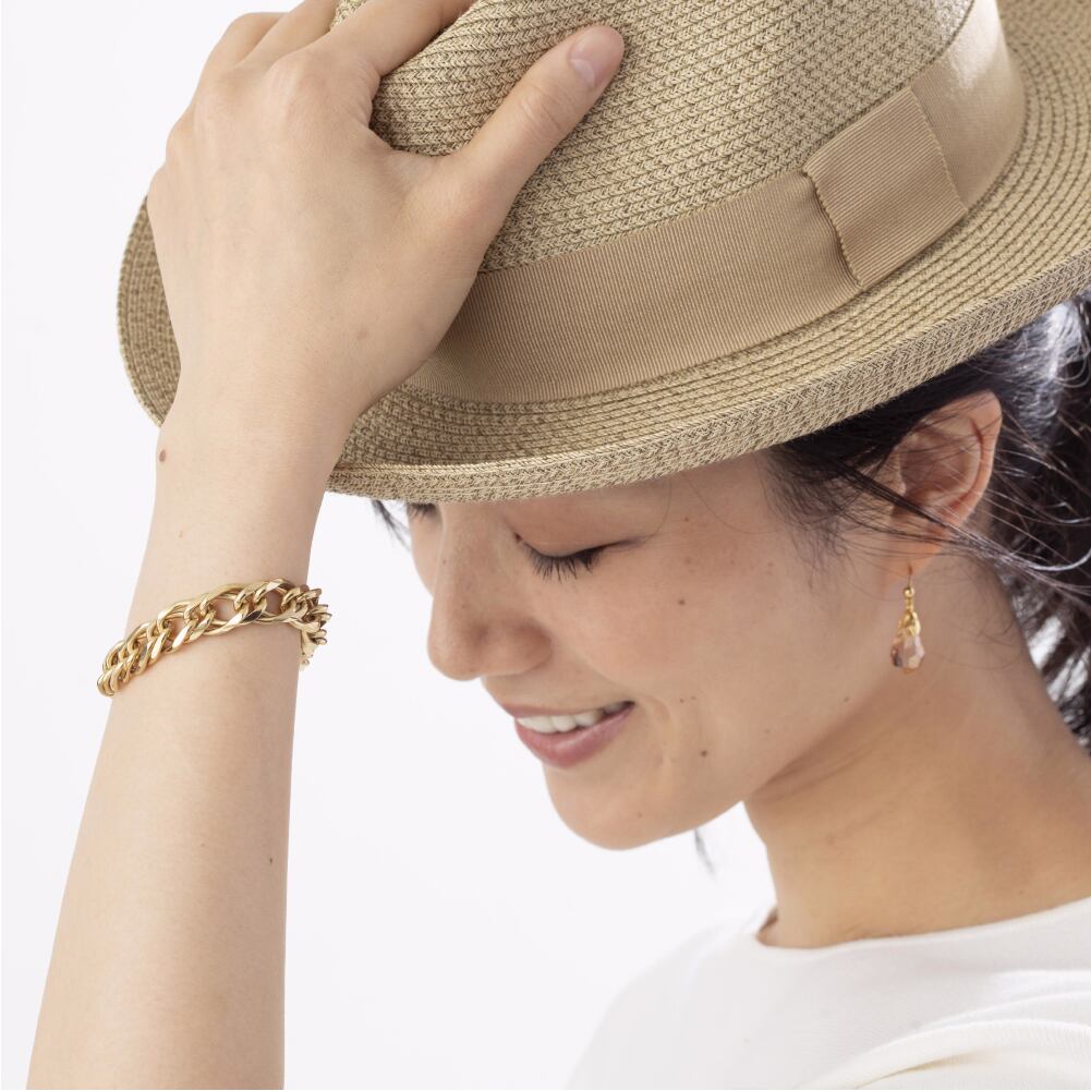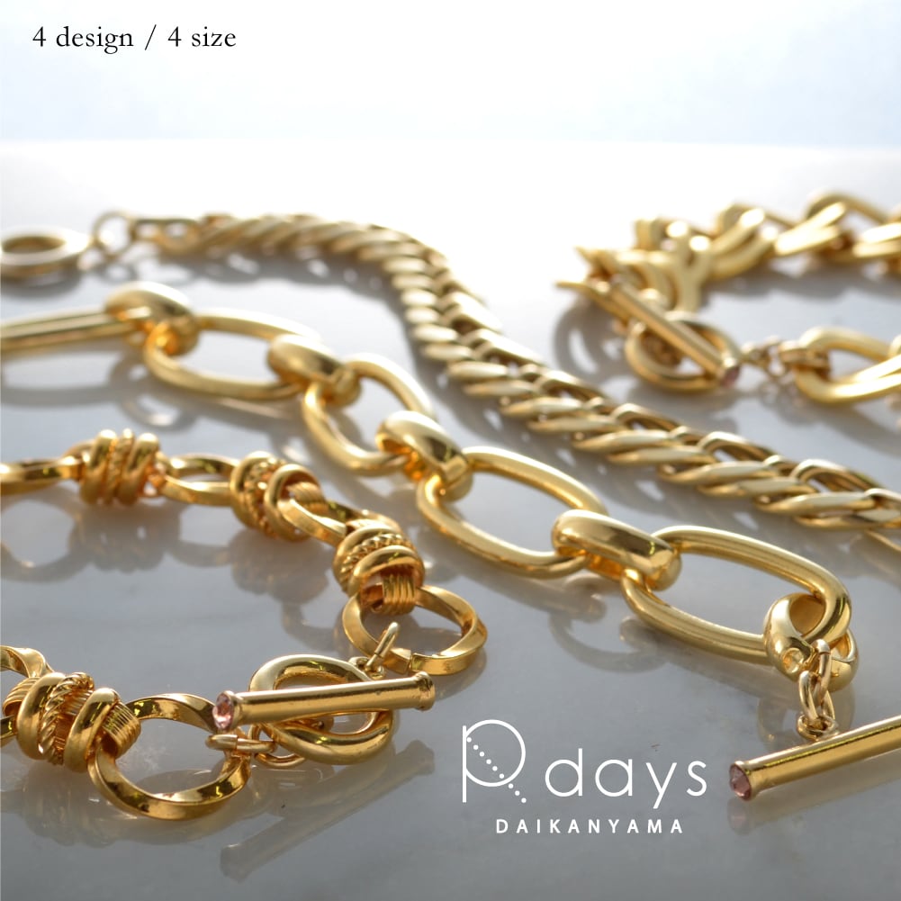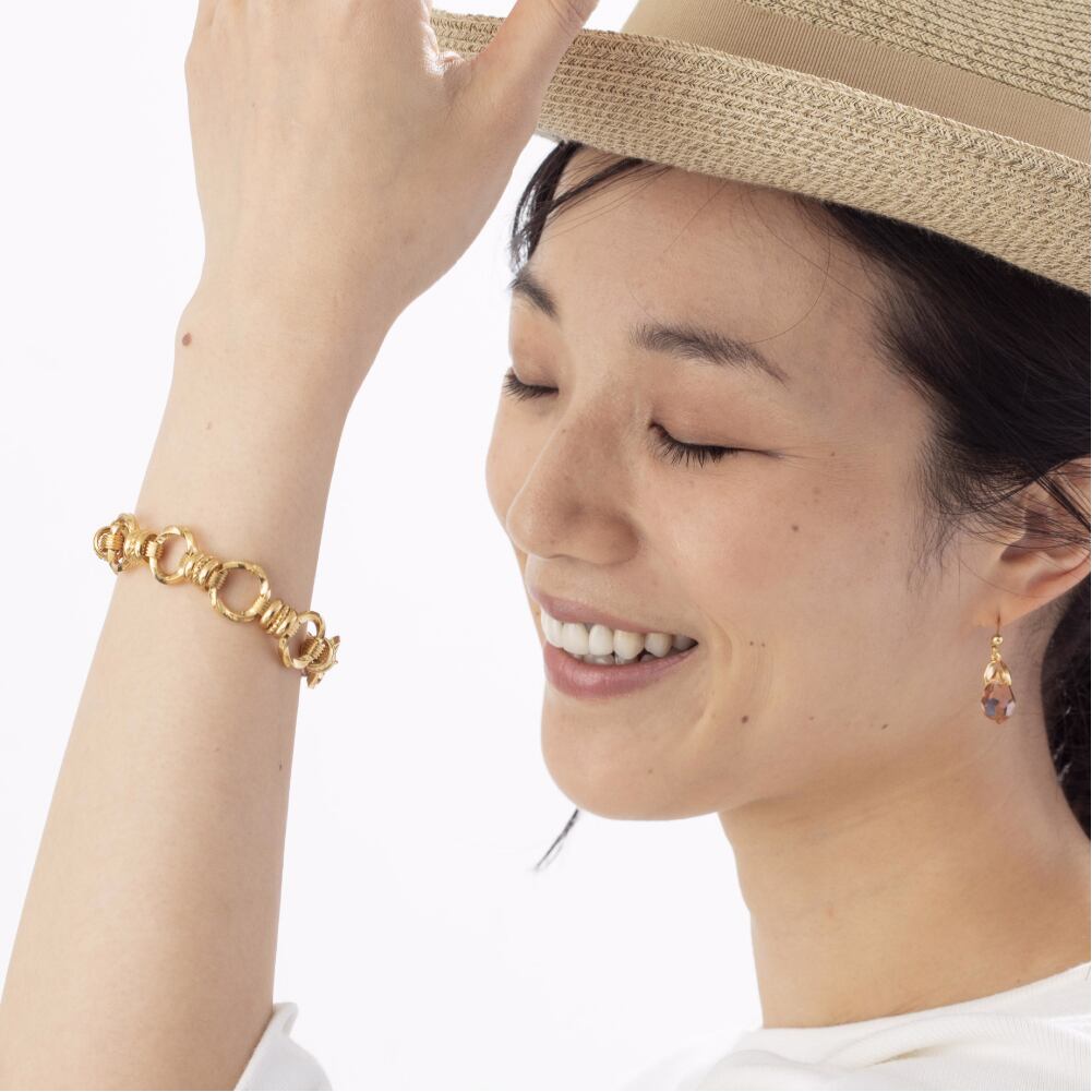 ボリュームのあるゴールドカラーのデザインチェーンブレスレット。コーディネイトを一気にトレンドの表情にするインパクト。