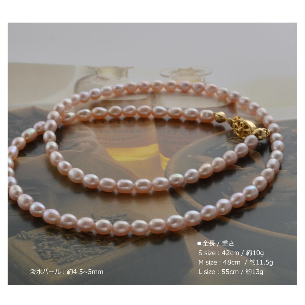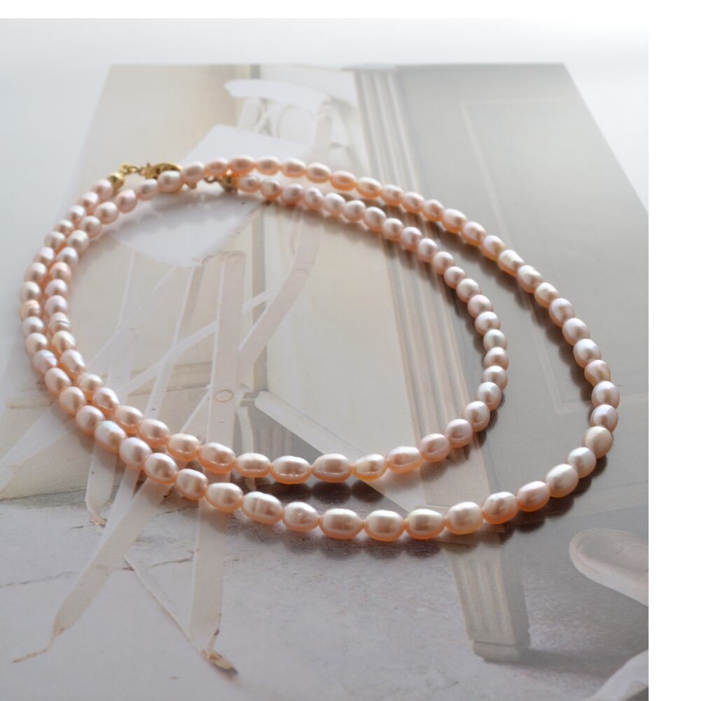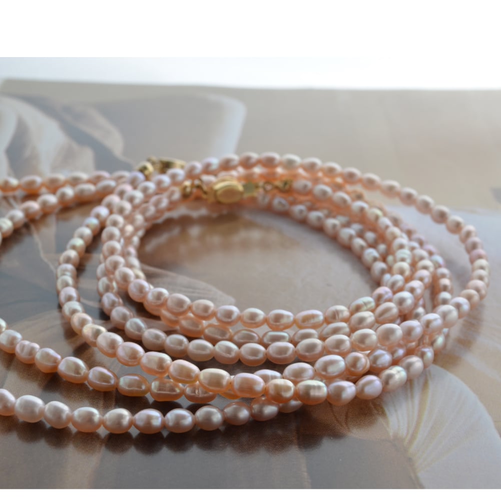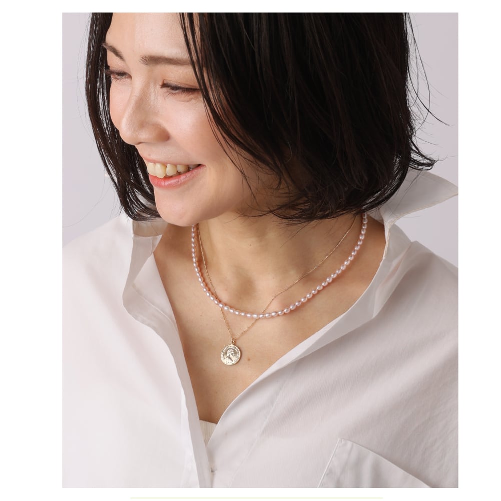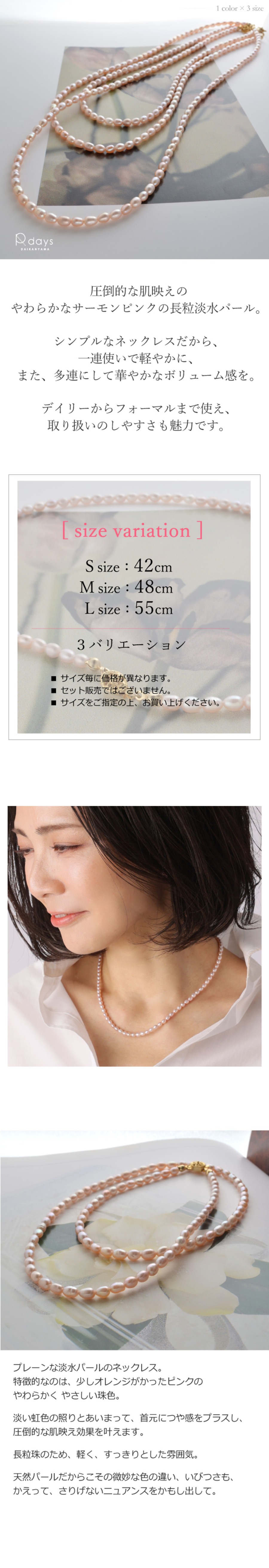 やわらかなサーモンピンクの長粒淡水パールネックレス。気になる首元に天然真珠の輝きで圧倒的な肌映え効果&品格・清楚さをプラス。3サイズ展開。多連使いやレイヤードスタイルも。