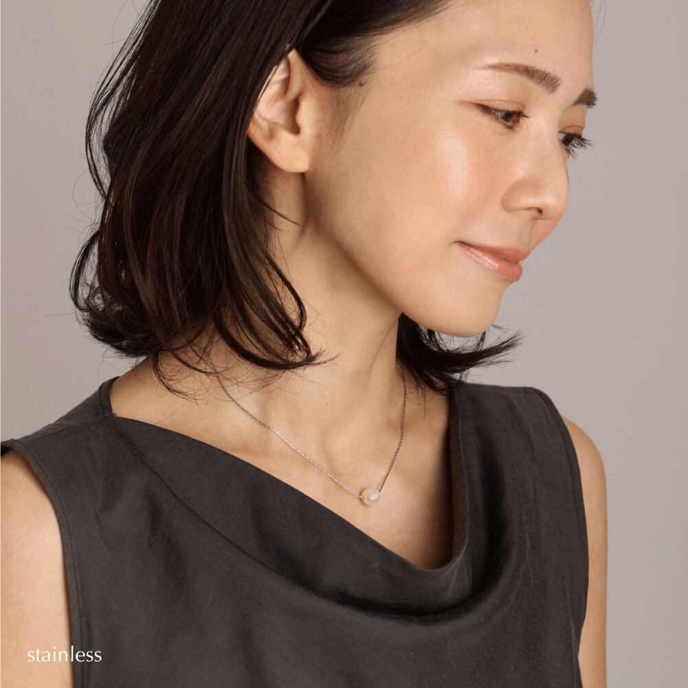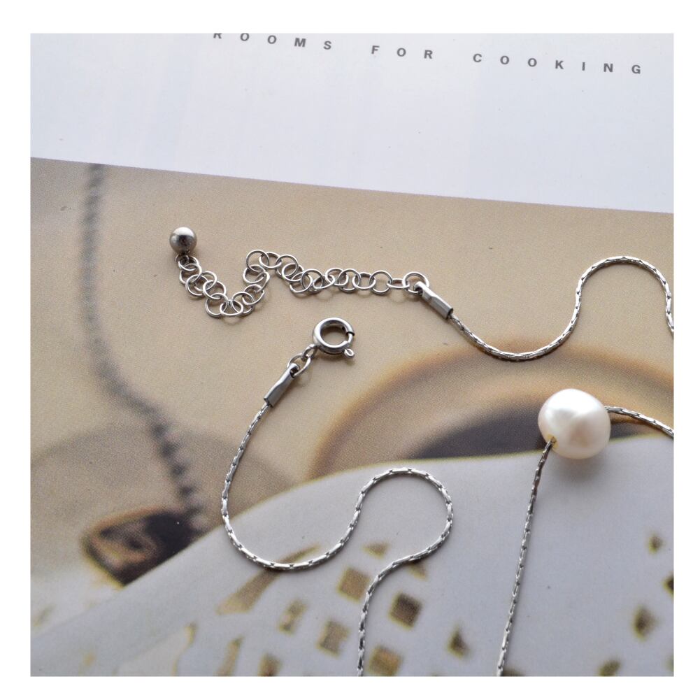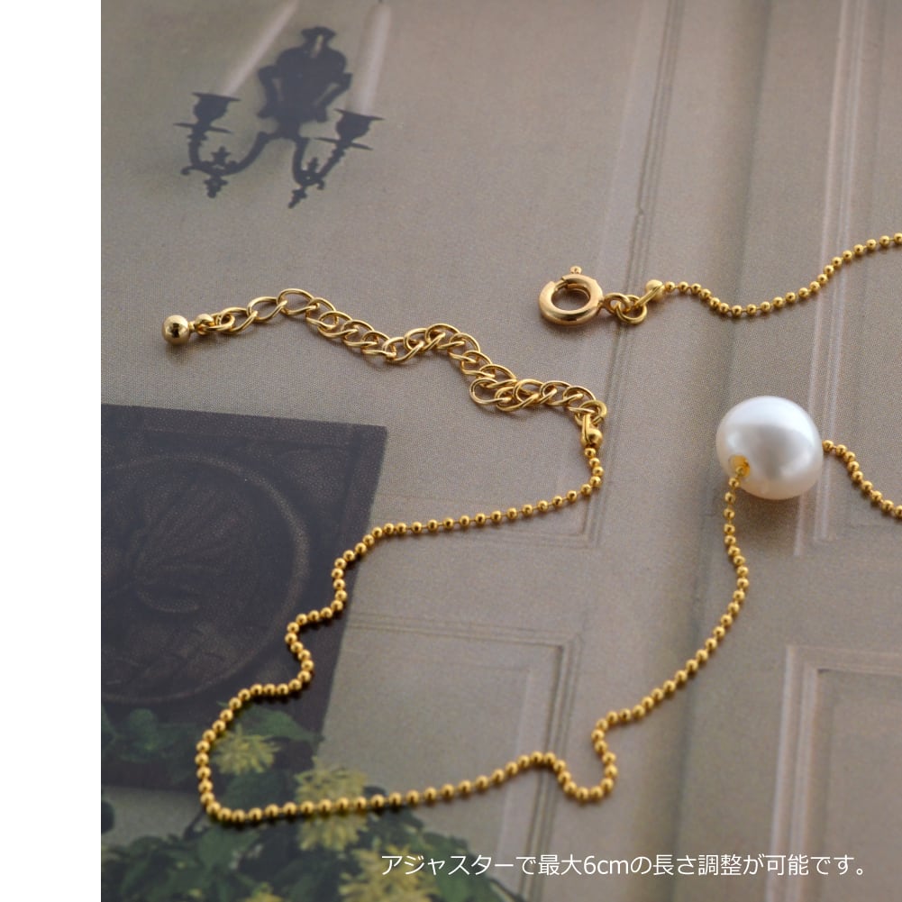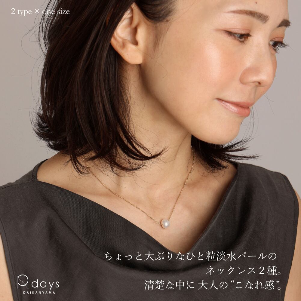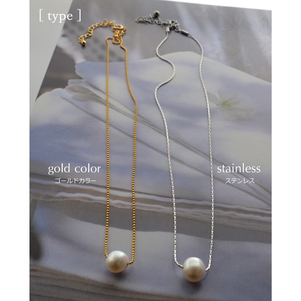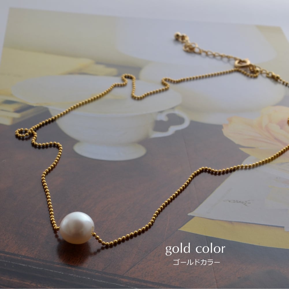 ちょっと大ぶりなひと粒淡水パールのネックレス。ゴールドのボールチェーンとステンレスチェーンの2種。まろやかな天然真珠の照り、どんなシーンにも映える清楚なネックレスです。